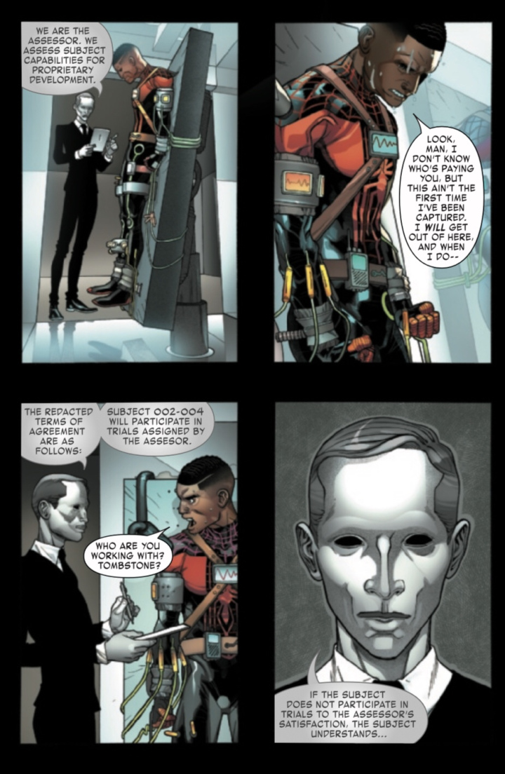 Whoever this guy is, comes off a bit threatening as we see, he has some leverage over Miles. Seems like this new villain wants to put Miles through some tests. Quite a few if I do say so myself. Sort of like what happened to Deadpool by the hands of Francis.