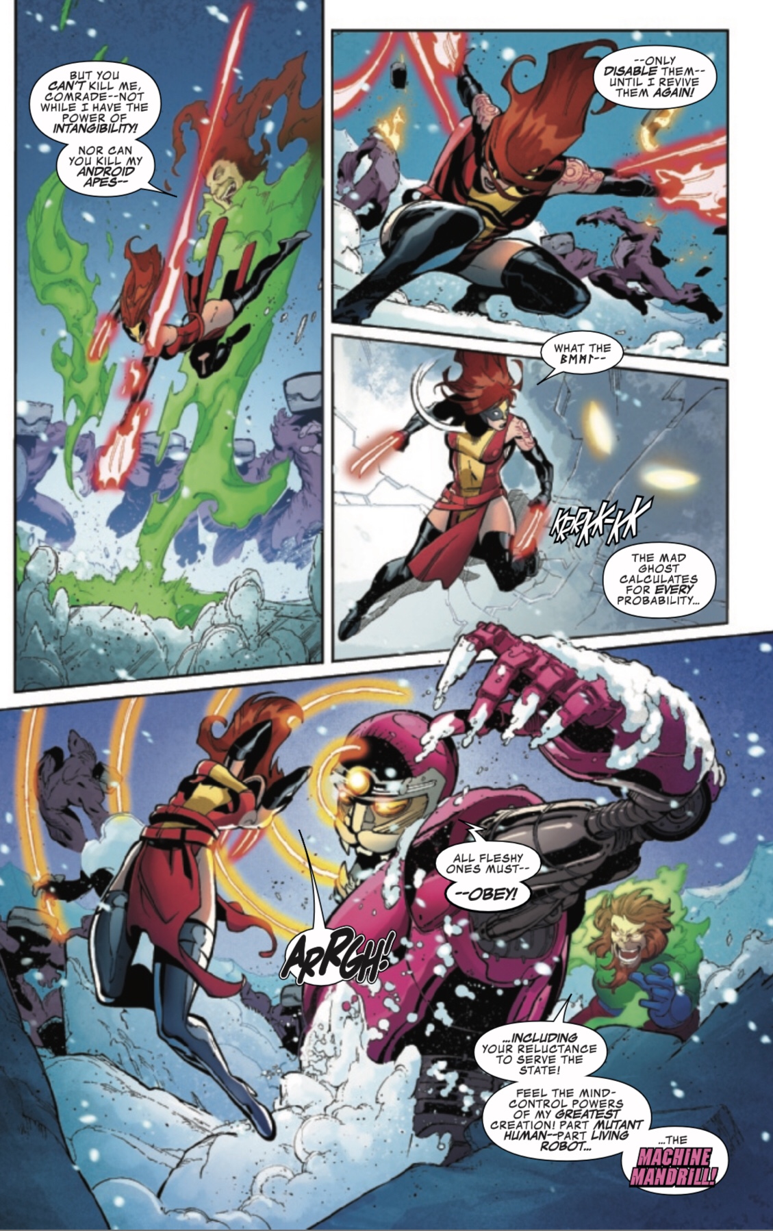 Now, there were many positives to the issue, especially both art teams. That said, let this reviewer focus on the aspiring narrative elements. The first positive part of the issue was Al Ewing sharing the biggest plot thread of them all at the beginning of the story. Readers find out about a flaw in the Soul Stone. Therefore, this reviewer wonders if the Warped villains know how to escape the Soul Stone and enter “our” Earth. Additionally, this fan loved the spell casting names and the witty saying like “Hex marks the spot” and “Hexacution”. Ewing added a lighter feel to an otherwise serious action tale.