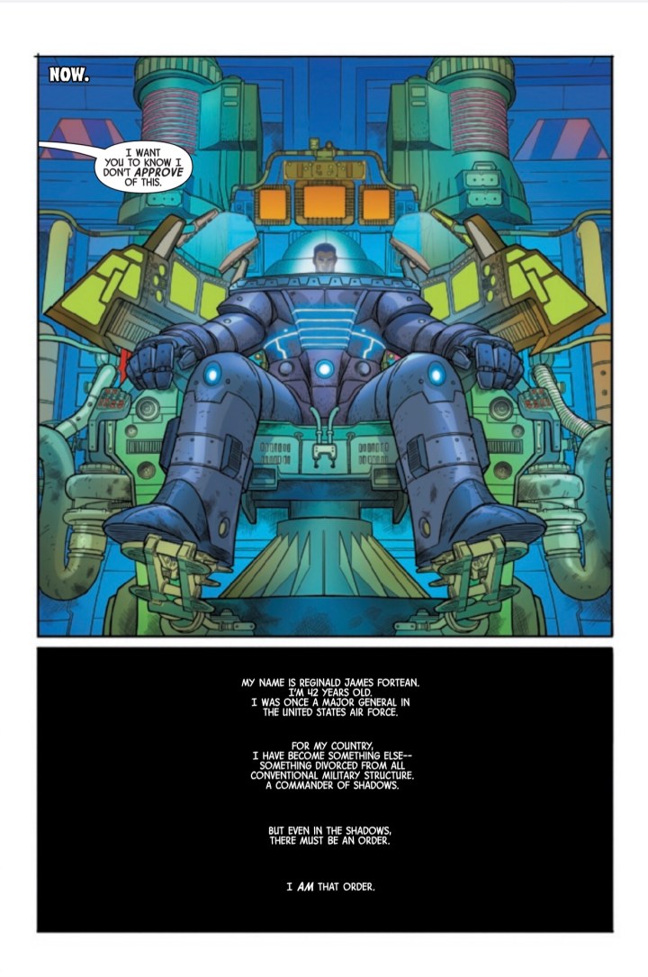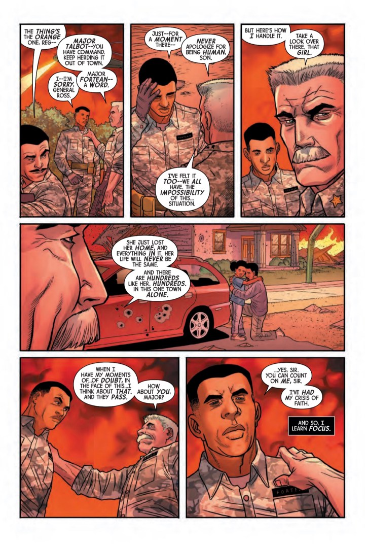 On top of all this reviewer mentioned above, the most sensationally extraordinary elements didn’t truly occur until almost the end of the issue. Ewing’s narrative takes a brutally maniacal turn as Fortean becomes a sadistic tyrant whose views become so insanely warped by his fascination with structure, normalcy, peace, and harmony that he’s willing to murder whoever it takes to accomplish his distorted views. Fortean lays waste to Gamma Flight after infiltrating their base with his teleportation suit, takes back the husk of the new Abomination, and willingly joins with the suit following in his mentor’s footsteps (Ross becoming Red Hulk). This scene totally blindsided this reviewer and left me super excited for the next issue.