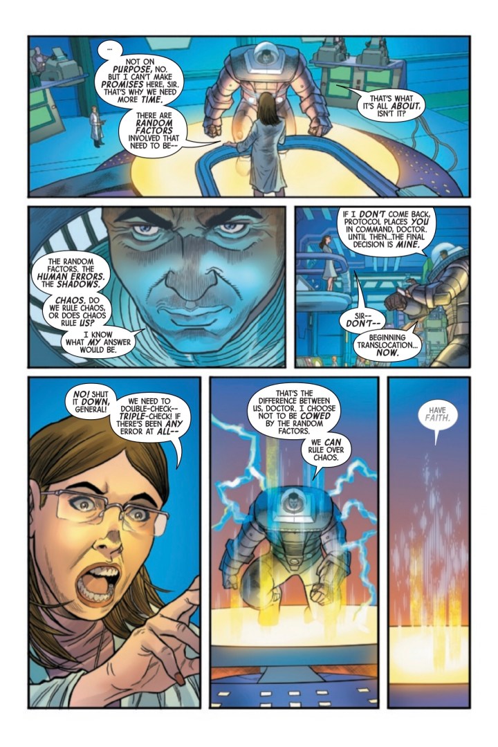 Readers probably didn’t see this issue coming at all. Remember, we left off last issue basically staring down Hell, Banner’s Pops, and Metatron. This issue opens with this reviewer actually feeling disappointed that we aren’t starting where we left off. However, even the parts that were a bit wordy were still interesting, thought out, and dynamic. Ewing incorporated the history of General Ross and intertwined it with Fortean’s own background wonderfully. Additionally, Ewing creates a teleportation suit while amplifying the sheer intelligence of Reed Richards making what Fortean is doing so much more plausible, destructive, and chaotic. Fans get explanations and reasoning that is often times missing in comics today.