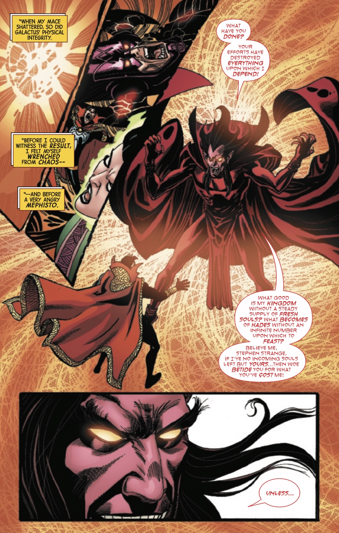 Even though Waid’s resourcefulness shined through, the complexities of the issue still weighed down the issue at times complicating certain aspects of the story that could have been glossed over without hindering the narrative. For example, the focus leaned more towards a deal with Mephisto, which was how Doctor Strange was able to survive Galactus’ implosion and destruction of the universe. However, this reviewer was confused as to why Hades survived but every other dimension didn’t. The purpose was obviously to redirect the series moving forward through these last couple issues. That said, this angle made the beginning of the comic cumbersome and threw this reviewer out of the narrative for the middle chunk of the story.