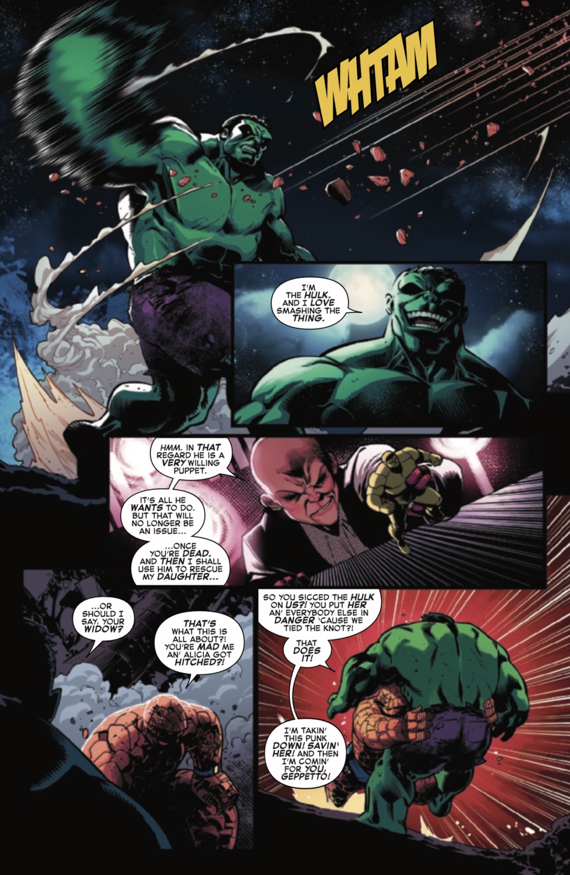 Honestly, nothing much happens throughout the issue and it’s a super quick read filled with high octane action, masterfully detailed art, and genuine entertainment. The only disappointing aspect to the issue was how Ben Grimm somehow defeats the Immortal Hulk with “heart” at the last minute. Something just didn’t smell right about that aspect of the issue. This reviewer was hoping that once Ben realized the Puppet Master was pulling the strings, he’d find a way of shaking Hulk loose. Sadly, that wasn’t the case. However, Slott’s line as the story ends from the Hulk when he says, “it was murder getting here. My own murder multiple times. Poor, puny, Banner kept drowning in the middle of the ocean…”, was the best part of the issue. Why? Well, Slott gets the landscape of the Marvel Universe and is willing to play well with others. Continuity and connection are so important to this reviewer and it earned Slott some brownie points from this IMMORTAL HULK fan. Slott simply gets it.