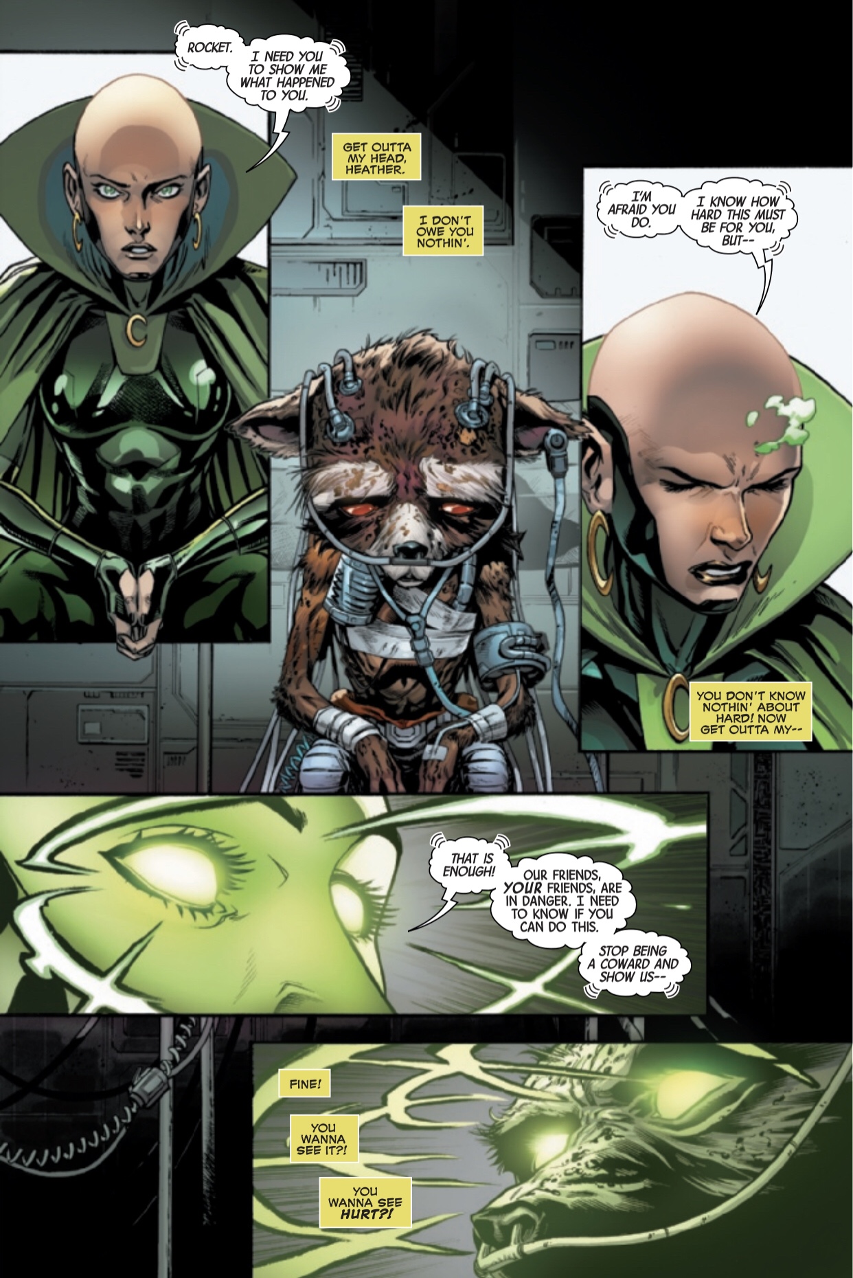 At the end of this horrific flashback rebirth sequence Rocket says how he started to not feel right. He started to feel like he was dying and admits that he didn’t want to be seen as a weak dying thing. He has given up hope and I AM GROOT has had enough. Groot pretty much calls his friend a pussy and says buck up lets go save our friends and find away to heal you. Rocket agrees and goes to suit up in a sweet looking Gundam Fighter.