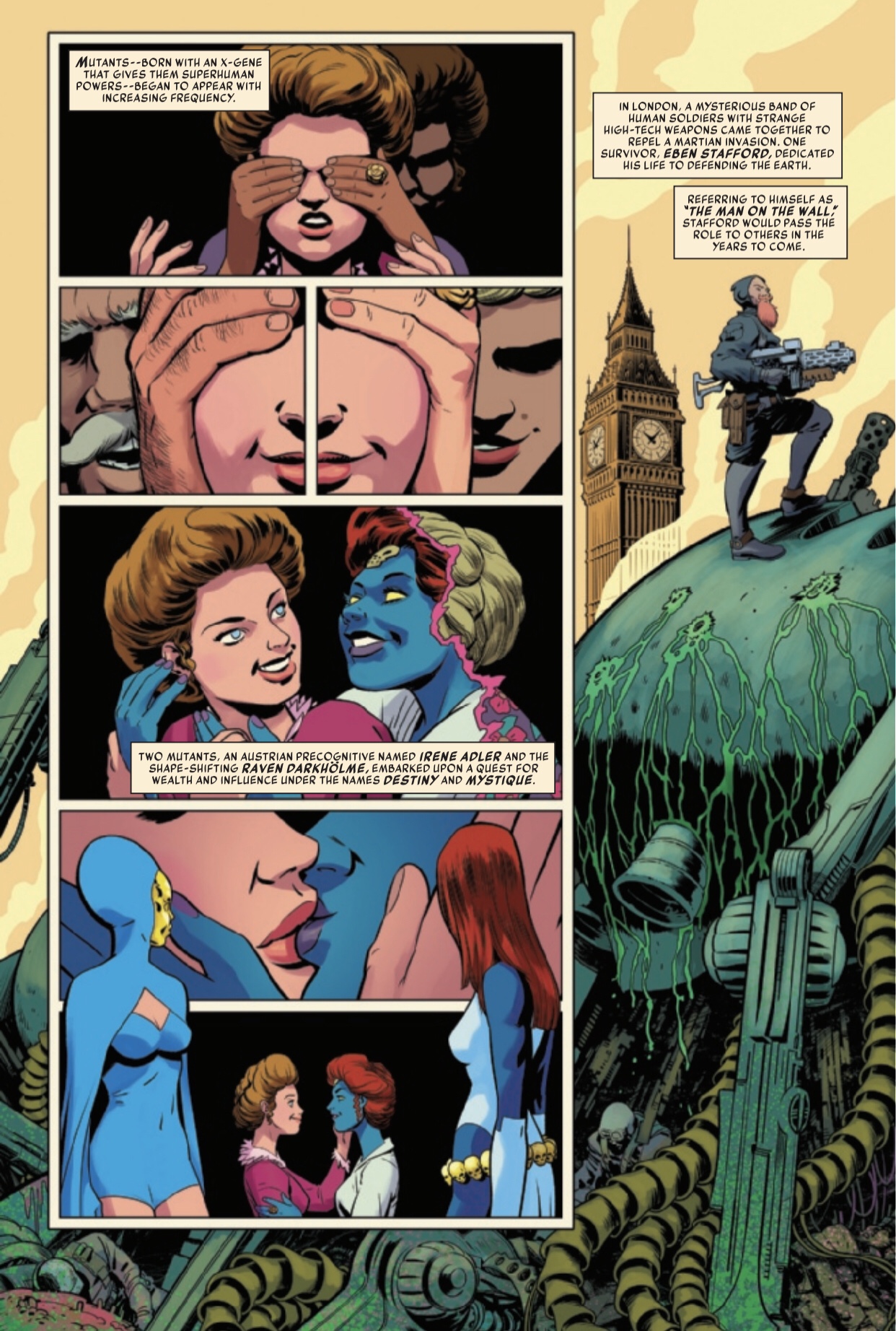 Waid strategical makes Steve Rogers the hidden focus of the HISTORY OF THE MARVEL UNIVERSE #2. Like a dusting of snow on each page, readers can see glimpses of the most prolific hero in Marvel surface into history from birth to his frozen demise. Other shocking surprises to this reviewer were how long ago Mystique and Destiny have been around, Nick Fury’s Infinity Formula, the origin of the Scarlet Witches powers, the first line of defense against the Skrulls, and the players involved in the original Avengers Initiative. This reviewer has read comics a long time, whether it be DC or Marvel. However, my jumping on point was always around the early 90’s, which is what makes this series so incredibly interesting to me. Therefore, seeing Waid drop these little informative nuggets throughout the issue really captivated this reviewers attention from start to finish.
