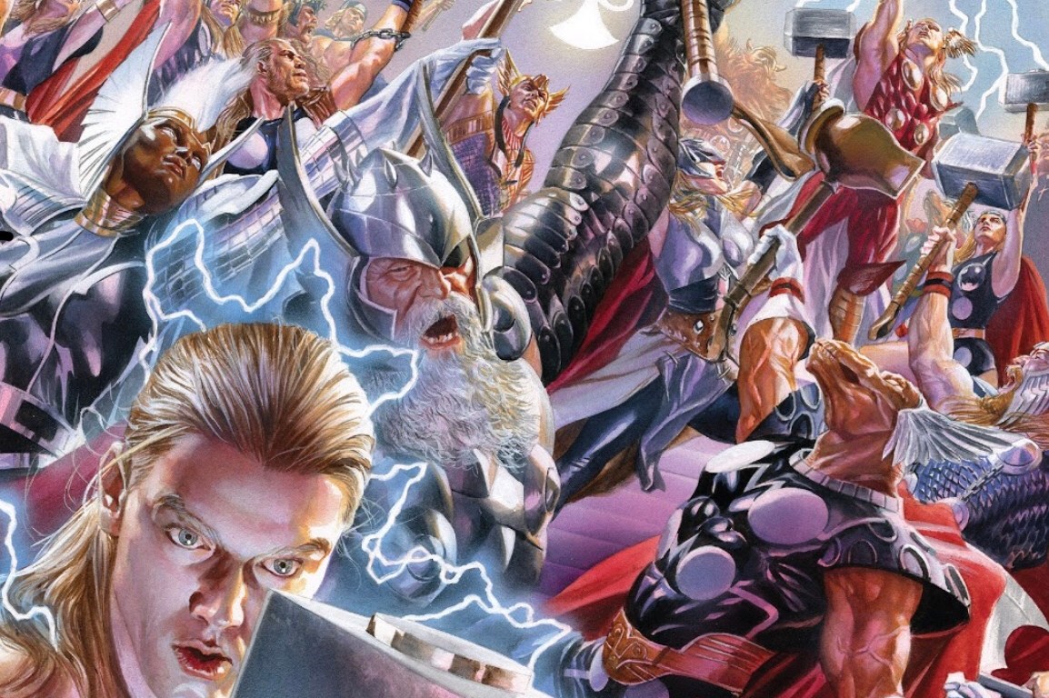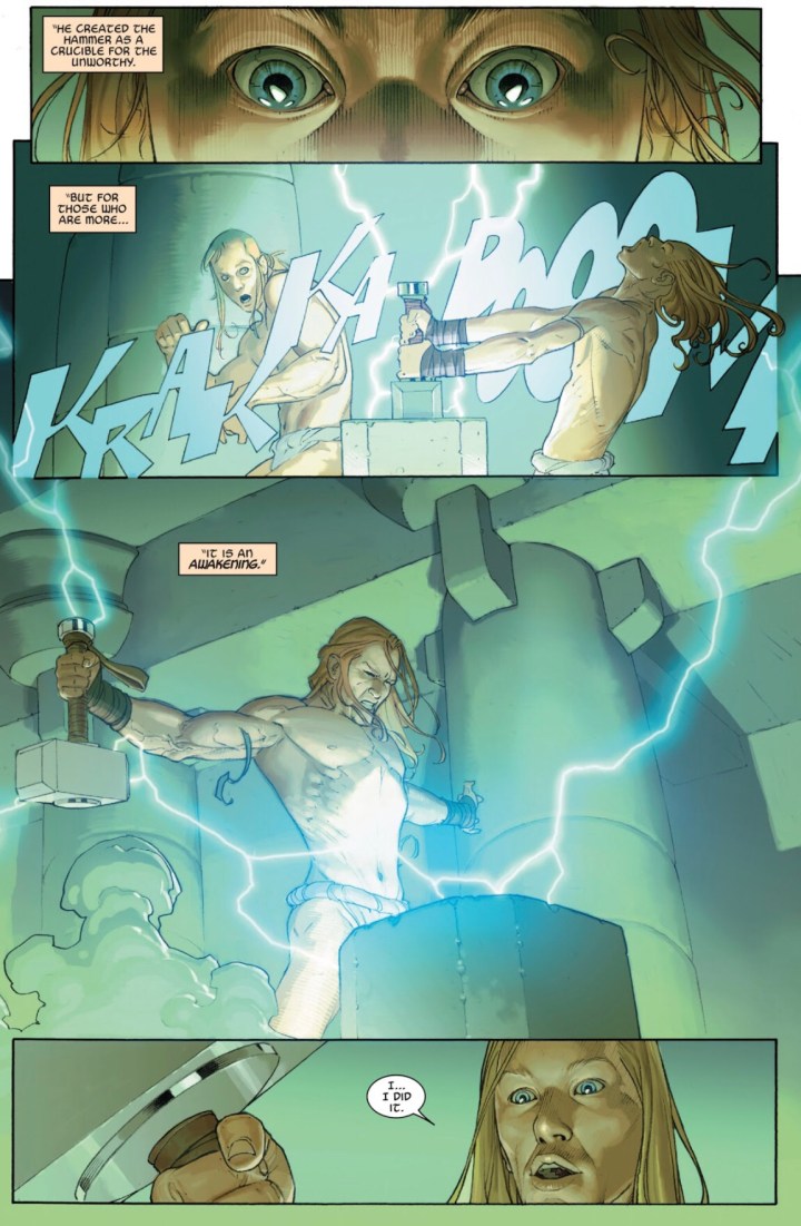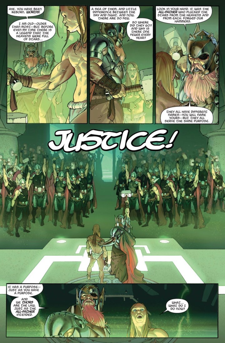 The immediate question everyone should have is, where are we? Is this Asgard? Or better yet, when are we? Is this the past? Readers dive immediately into the issue with what appears to be a scrawny-looking Thor attempting to pick up Mjolnir beside the All-Father Odin. However, these questions are short-lived because the big reveal as the story opens is that Doom is somehow the All-Father and the room is filled with hundreds of Thor’s wielding their own hammers!