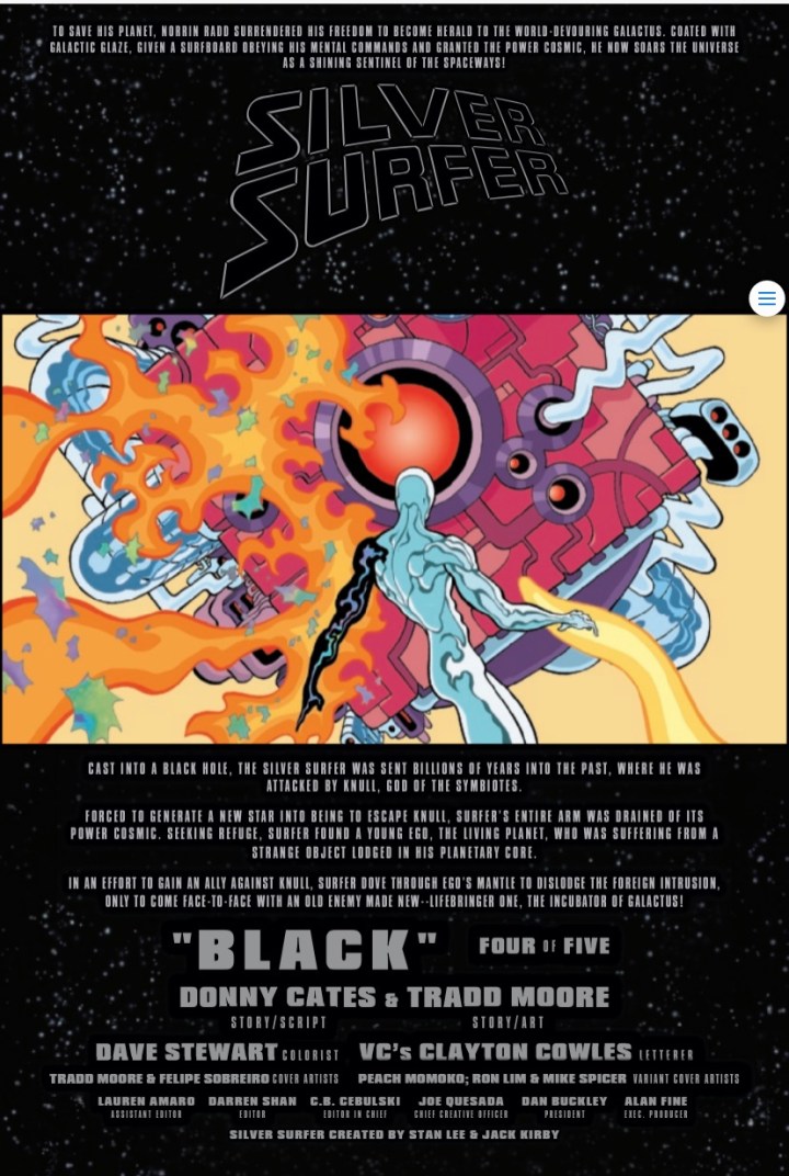 As the Surfer feels the Symbiote spreading across his body Ego reminds him that he will uphold his end of the deal that he made in issue #3 and help the Surfer in return for helping cure him of his pain.