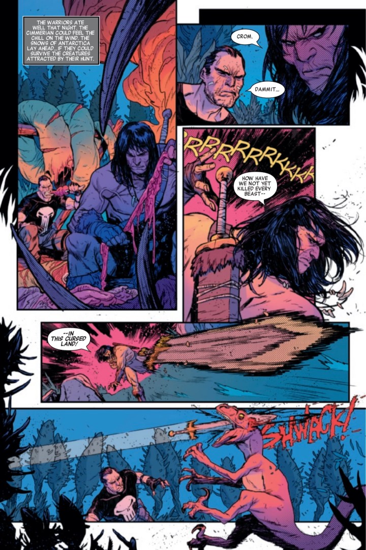 Conan & The Punisher attempt to walk out of the Savage Land hauling the caskets of Frank’s family… through Antarctica. Frank Castle never was much of a religious man…but now he’s firmly “Crom-curious” Watch out for the last page, it’s a doozy.