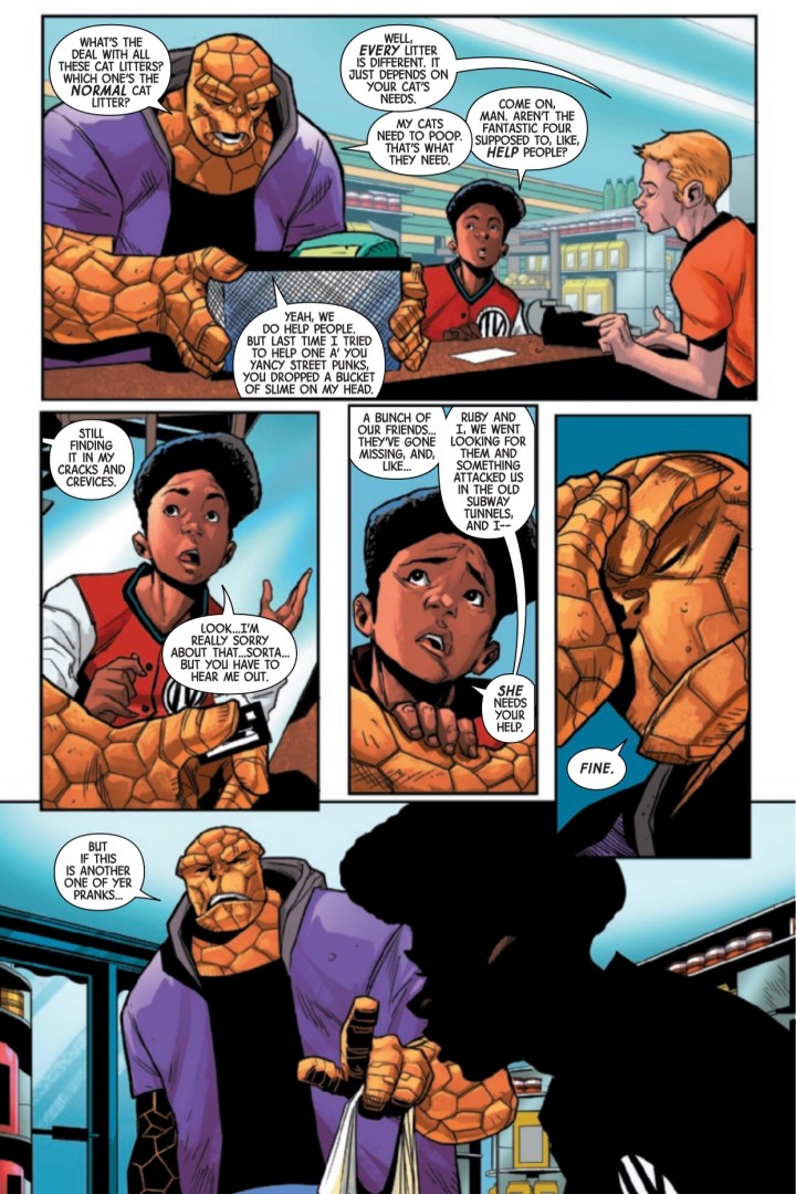 Some of the remarkable highlights of CONTAGION #1 were the subtle 80’s humor, Reed Richards’ outlook on the importance of saving every life, and the outstandingly vivid art by Rogê Antônio and the art team. Veronica Gandini’s colors, especially encompassing the contagion, were so incredibly bright, which ultimately illustrated the devastating effect this outbreak is set to have in the future. The greens were extremely intense and loaded with such a huge punch that amplifying each page bringing the issue that extra spark needed to drive home the impact of the mysterious epidemic. Readers can physically see how well Brisson and his art team worked together throughout this opening epic.