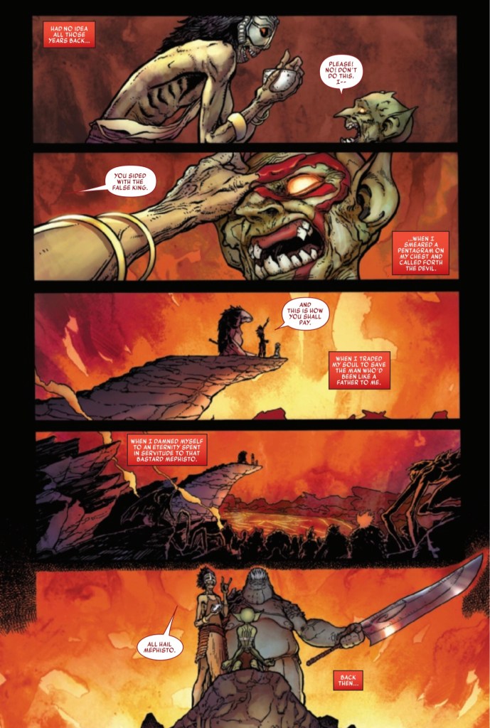We open in the pits of hell with Mephisto loyal demons performing a ritualistic sacrifice on a Ghost Rider loyal demon. This sacrifice gives them the power needed to open a portal to Earth, but before they are able to pass through the vail their unelected King comes to reclaim their damned souls in a glorious ferocious flurry of chains.