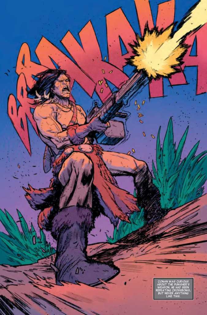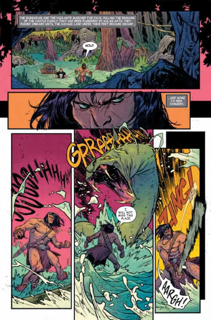 The issue opens with Frank Castle and Conan still dragging the coffins containing Frank’s family through the Savage lands and while it took me a little to get used to Kim Jacinto’s art, once I did I started to really like it. However, the rinse repeat nature of the action here did not have me pumped up, though I did like seeing Conan shooting a gun like a barbarian Rambo! Even after that, though, Gerry Duggan does take care to show that Conan isn’t all muscles and swords…he’s also a hell of a knitter as well. It’s a good thing, too!