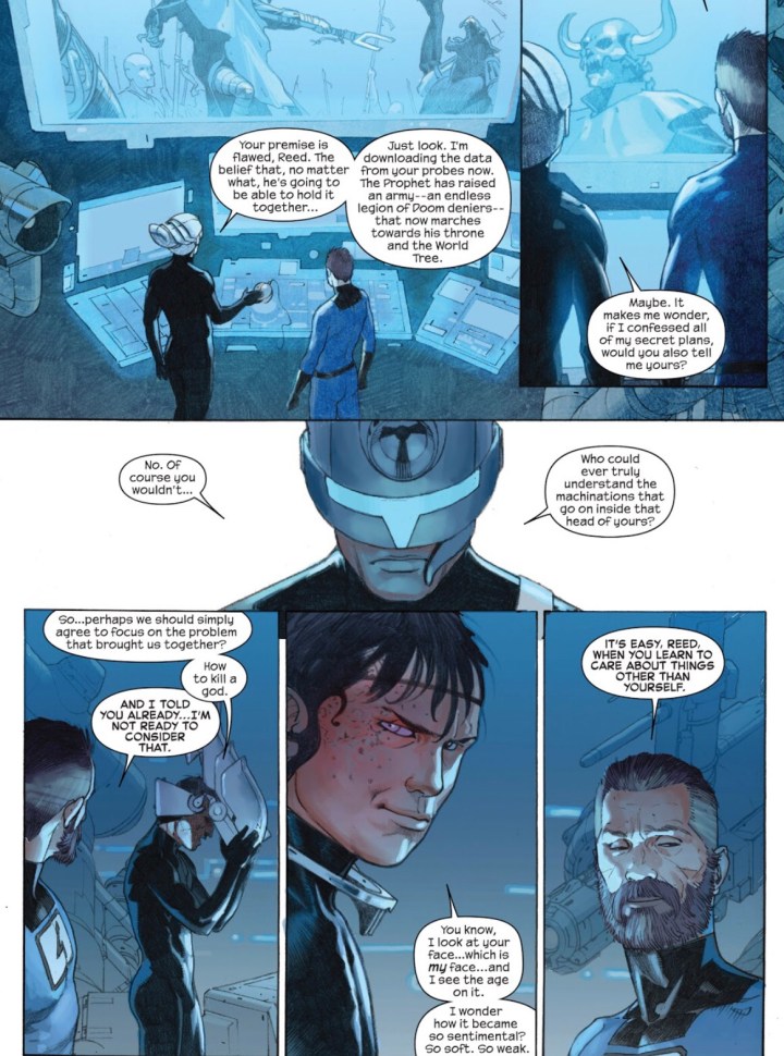 Taking a look at the issue more critically, readers will recognize that it is a bit more wordy than normal, isn’t as fast-paced as usual, and had very little action throughout the issue. Due to the prior statements, many fans would classify this narrative as a bit stale or boring. However, there are numerous paths to attract the reader. This issue was easy to follow, extremely creative, intuitive, and leaves this critic believing the stakes are extremely high. Furthermore, the clever nature that Hickman inaugurates small nuggets that will become vital down the line is an art form all to itself. For example, the story opens with no one knowing where God-Doom’s power came from. Then, readers find out exactly where his power came from when Victor talks to Owen about Doctor Strange’s death in the last issue. Now, Valeria, the Future Foundation, Peter, Miles, and probably both Reed’s have an idea. The secret is growing.