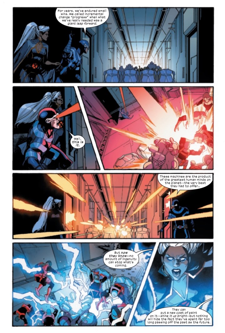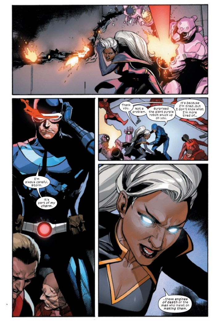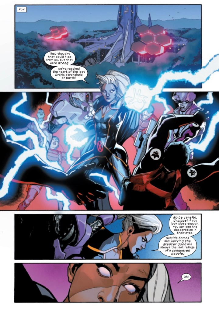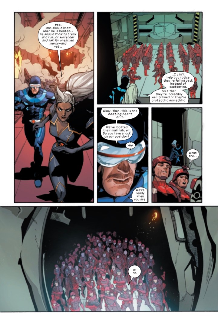 Hickman’s focus this issue was largely to lay out all of the big players on both sides of this war. Some new key players are introduced on both sides, a family dynamic is established, and readers are left with the impression that the Mother Mold Space mission may not have been as much of a success as the X-Men, as well as readers, may have speculated before. Hickman definitely placed many more plot threads throughout this issue that will need to be thoroughly examined and tweaked out as the comic unfolds. Additionally, there were two huge aspects of this issue that were extremely interesting. One of these is an individual Scott and Storm find early on in the issue and the other is the pretty big cliffhanger that Hickman dangles out there for readers.