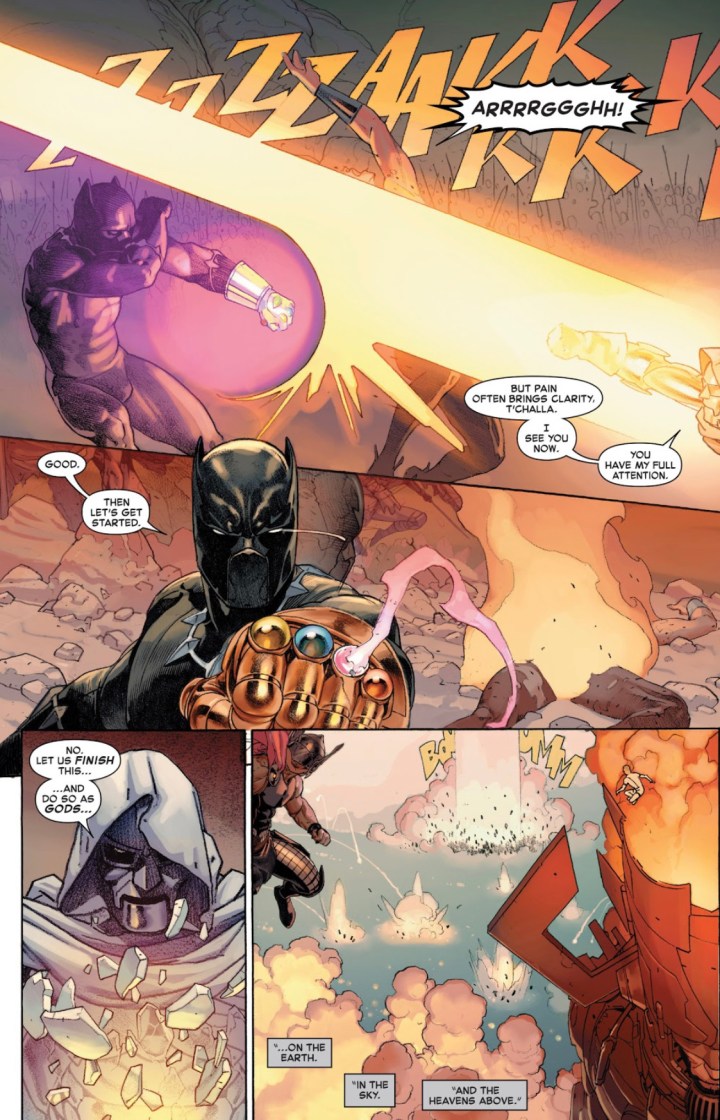 Now, one of the massive takeaways this critic had from this issue was when Reed points out to Victor that one of his first acts as a God was to literally take Reeds family from him. Victor could have accomplished anything first, including creating a brand new family for himself. However, he chose Reed’s family. The angle Hickman takes throughout this entire series, as well as his run, is the beating heart of Victor towards Reed’s family, as well as his life overall. Hickman showcases Victor’s jealousy, resentment, pride, and arrogance throughout this event and elevates it to an entirely new level as this issue comes to a close. The icing on the cake is the ending to this stunning anecdote as Reed actually gets Victor to do the unthinkable; admit that Reed would have done a better job as God. That moment alone made this critic do a double-take. Ultimately, Hickman drives the story forward with the classic balance of power between two of the most brilliant minds in the Marvel Universe and again hammers home this unshakable bond between these two equal and opposite forces.