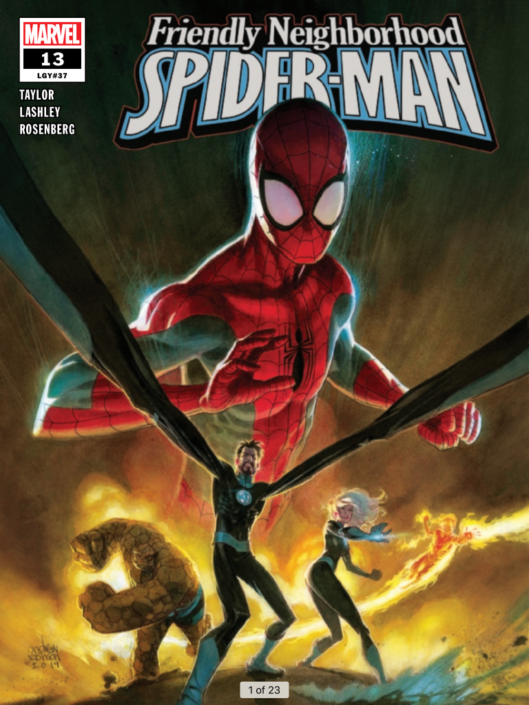 Spidey and Fantastic Four (FF for brevity here on out) meet up with Leilani and her little rugrats Jasper and Tierra, who get to meet their FAVOURITE Super-Hero: The Human Torch? Isn’t this Spidey’s book? At any rate, we get caught up on why Hale Carrick, tyrant and dictator or Under York, has such a beef with Spidey, and why Its so important to keep Jasper out of Carrick’s hands. Spidey and the FF take an elevator (yes, an elevator) down to Under York, where Spidey is a tiny bit chagrined to learn that he and the FF are going to help overthrow the dictator.
