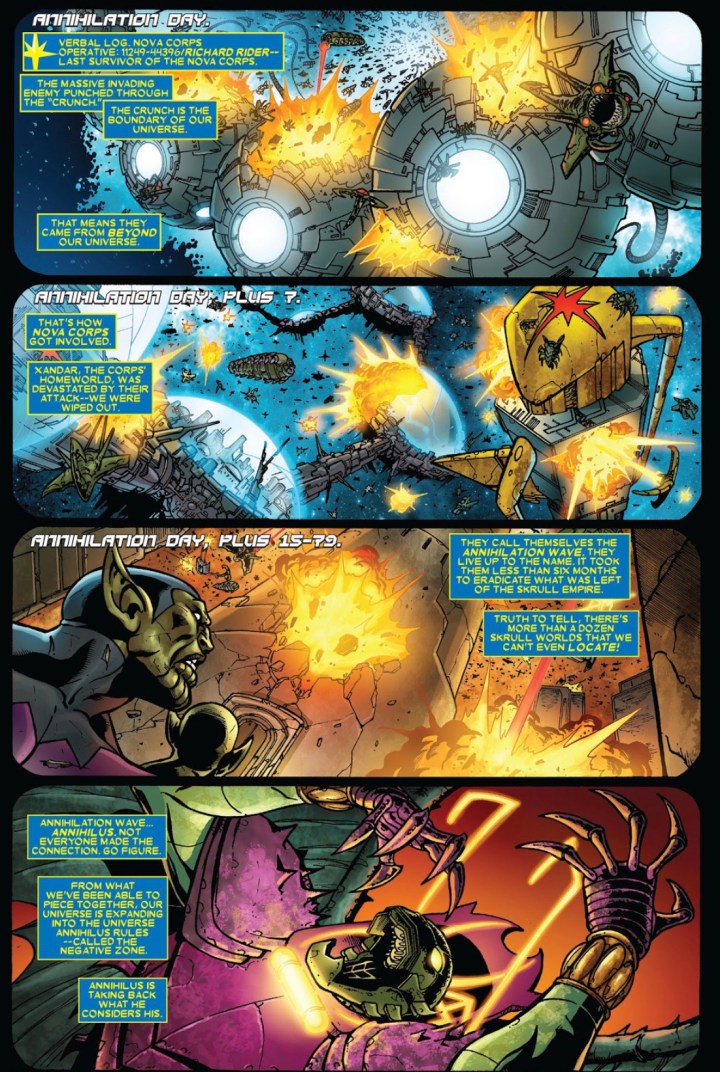 Readers, before this reviewer lunges into the issue, let me catch you up. Annihilus launched a means to break through the Negative Zone and into our universe through what’s called “The Crunch”. His forces have already eradicated multiple Skrull worlds, as well as Xandar, which is home of the Nova Corps. Many have fled and banded together to generate a universal military force in order to stop the Annihilation Wave from carving its way across the universe.