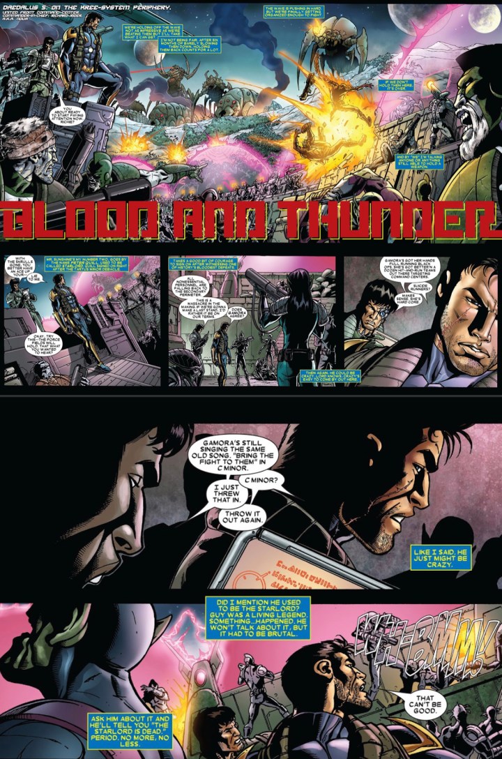 As for Giffen’s inscribing throughout this opener, there was an abundance of monologues that weighed the issue down immensely. Giffen really plunged deep into Richard Rider’s thoughts and feelings related to the war, which is actually what made this comic feel different than almost every other event this critic has read. The positives of this extra dialogue were the sensation, atmosphere, and saturation associated with an unstoppable war of suicidal chaos that relentlessly was bombarding the Marvel cosmos. Right out of the gate, Giffen made this appear like an impossible task to overcome. However, the excessive monologuing was extremely wordy at times, unnecessary, and made large chunks of the narrative tedious. Hopefully, Giffen can find a better balance next issue.