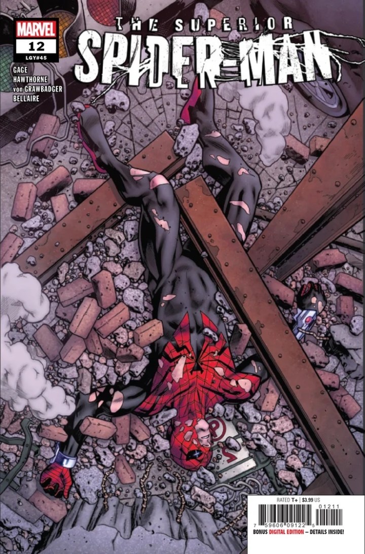This “superior” cover shows a badly damaged Superior Spider-Man. And as this series ends, who will remain? Spider-Man or Doc Ock??