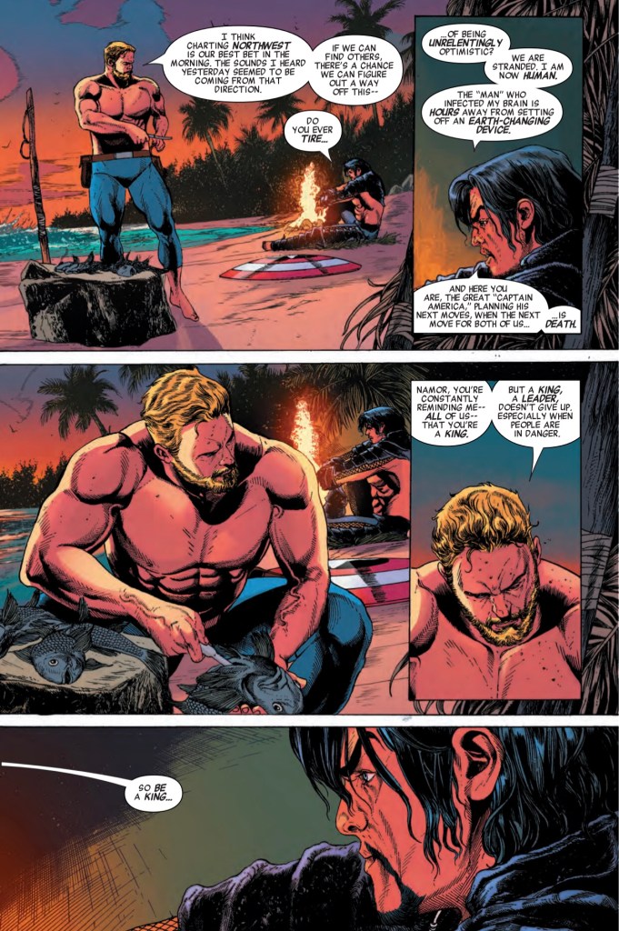 Steve and Namor then break it down and while Steve throws massive shade at Charles Xavier (good! That guy’s been riding a bit too high lately), Namor only blames himself. It’s a bit of superhero nature vs nurture and I’m kind of in the middle of the debate of whether Namor would have done those bad things without Machan in his head.
