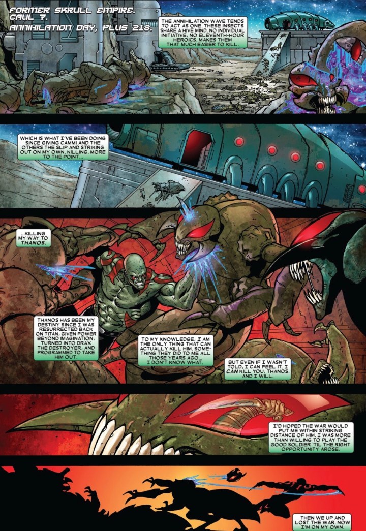 That said, let’s not critique the issue of what ”we” wanted. Instead, let’s focus on what was received and the story Keith Giffen laid out for fans. This issue was intense, violent, enthusiastic, and extremely driven. However, this reviewer questioned how an entire militia was unable to put a dent into this Annihilation Wave, but, Drax the Destroyer appeared to be able to eradicate thousands in an attempt to work his way to Thanos. Furthermore, this comic fan was stunned to see how truly connected Drax and Thanos are. Sure, readers like myself know of their history but his relentless fortitude came across as unnerving at times. Readers may need to dive into some old issues of Drax and Thanos to excavate deeper into this “special” bond these two characters have with one another.