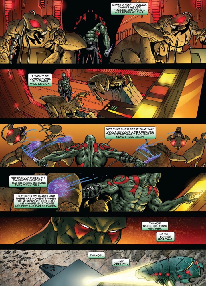 This issue felt like Giffen was striving to make pieces of the puzzle fit together because the story was getting backed into a corner. The next logical step was for Earth’s Heroes to help… however they’re in a Civil War. Therefore, they can’t help. Well, why did Giffen send them towards Earth to hide? The only practical answer was to attempt to relate the current Marvel Landscape at that time. Hence, Giffen had to now think of a new way to stop the Annihilation Wave. Enter the one-man saxophone playing Drax, Peter Quill, and Nova. This reader can now only speculate that fans will see an explanation suggesting that this was the plan all along from Nova and Drax. One can only hope that is not the case. This reviewer absolutely hates thrown in, mid-story, semi-retcons to make stories fit. “See, this was the plan all along!” Again I say… Ok, Karen. But, let’s not got ahead of ourselves.