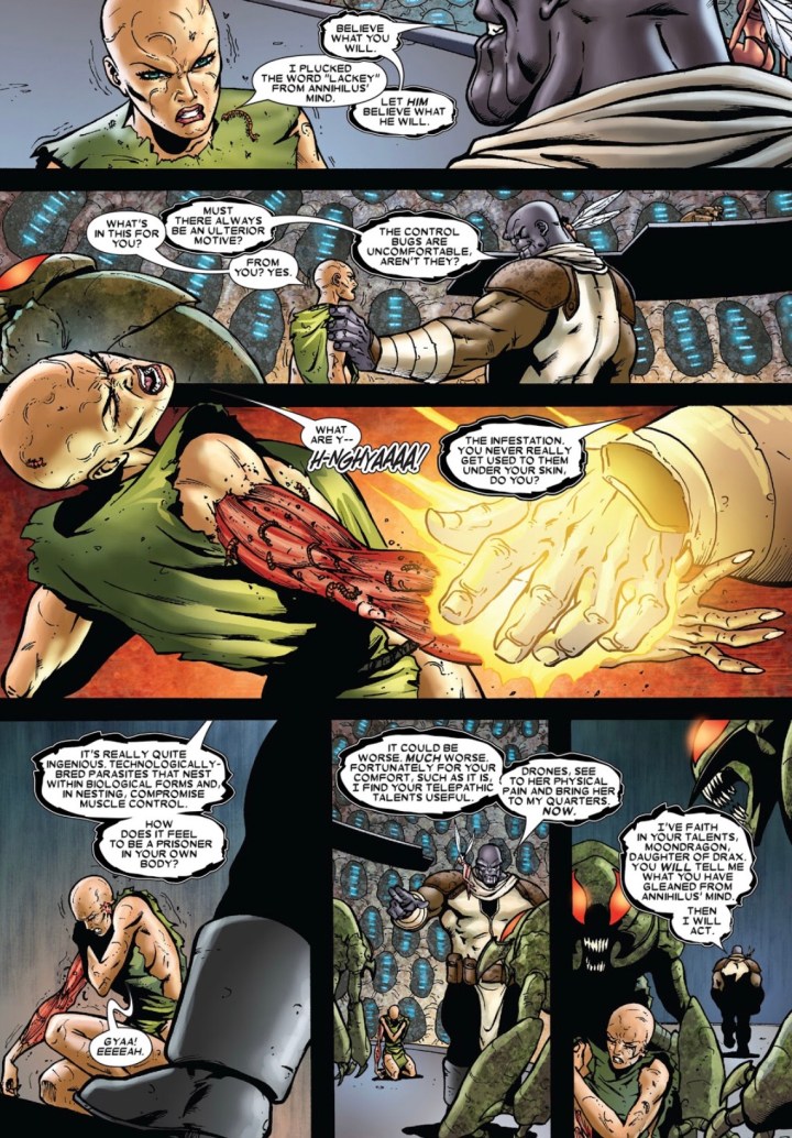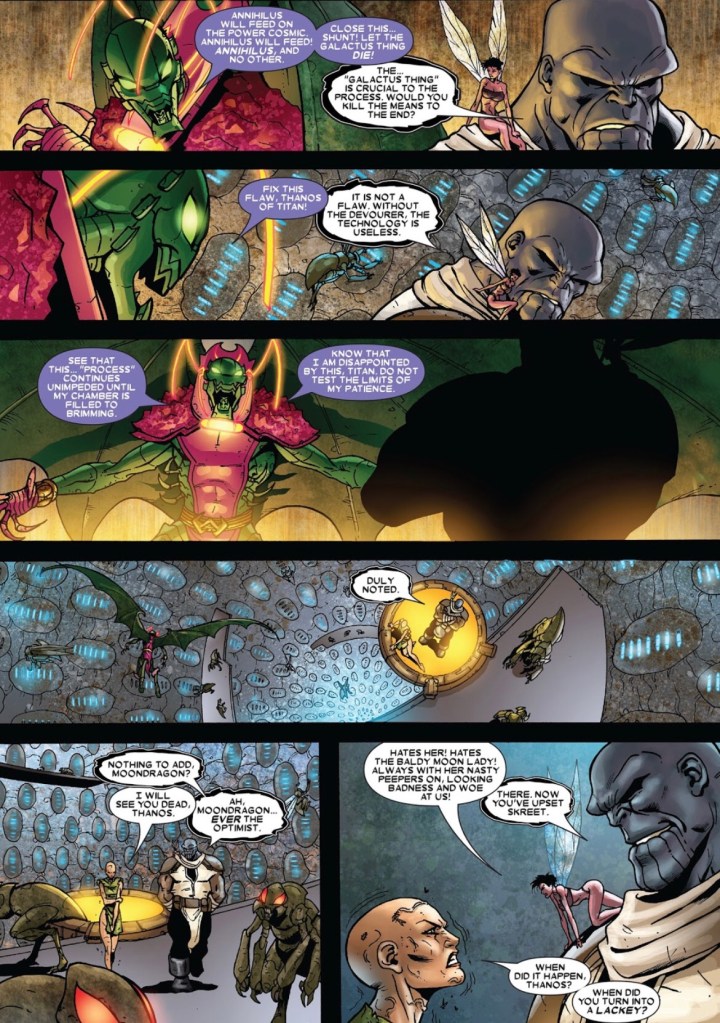Ultimately, the story is overly straightforward except for one small detail that Giffen tosses into the anecdote in a manner that seems like a throwaway line. Thanos is asked by Moondragon as to why he ever got involved with Annihilus in the first place. Thanos’ response was “I was curious to see how a radical tilt in the universal balance would play out.” Really? Thanos helped Annihilus simply for curiosity? Ok, Karen. Giffen, this critic is sorry, but that’s not acceptable. Thanos, the Mad Titan who has an agenda for every plan, desires to control and take over the entirety of the known universe, simply signed up with this bug lord out of curiosity. This doesn’t fit Thanos’ character or modus operandi at all. Furthermore, readers later discover that the Mad Titan was being manipulated and used by Annihilus, which is something even less likely to happen. This plot thread seemed like a huge stretch to this comic fan.