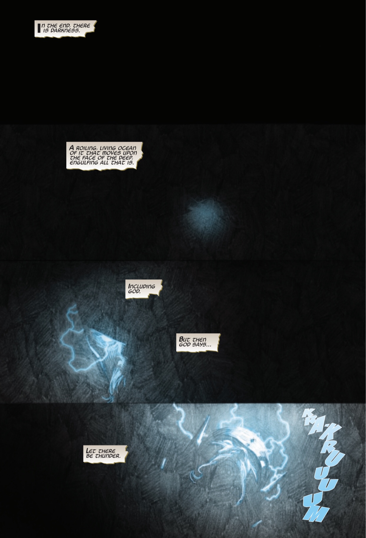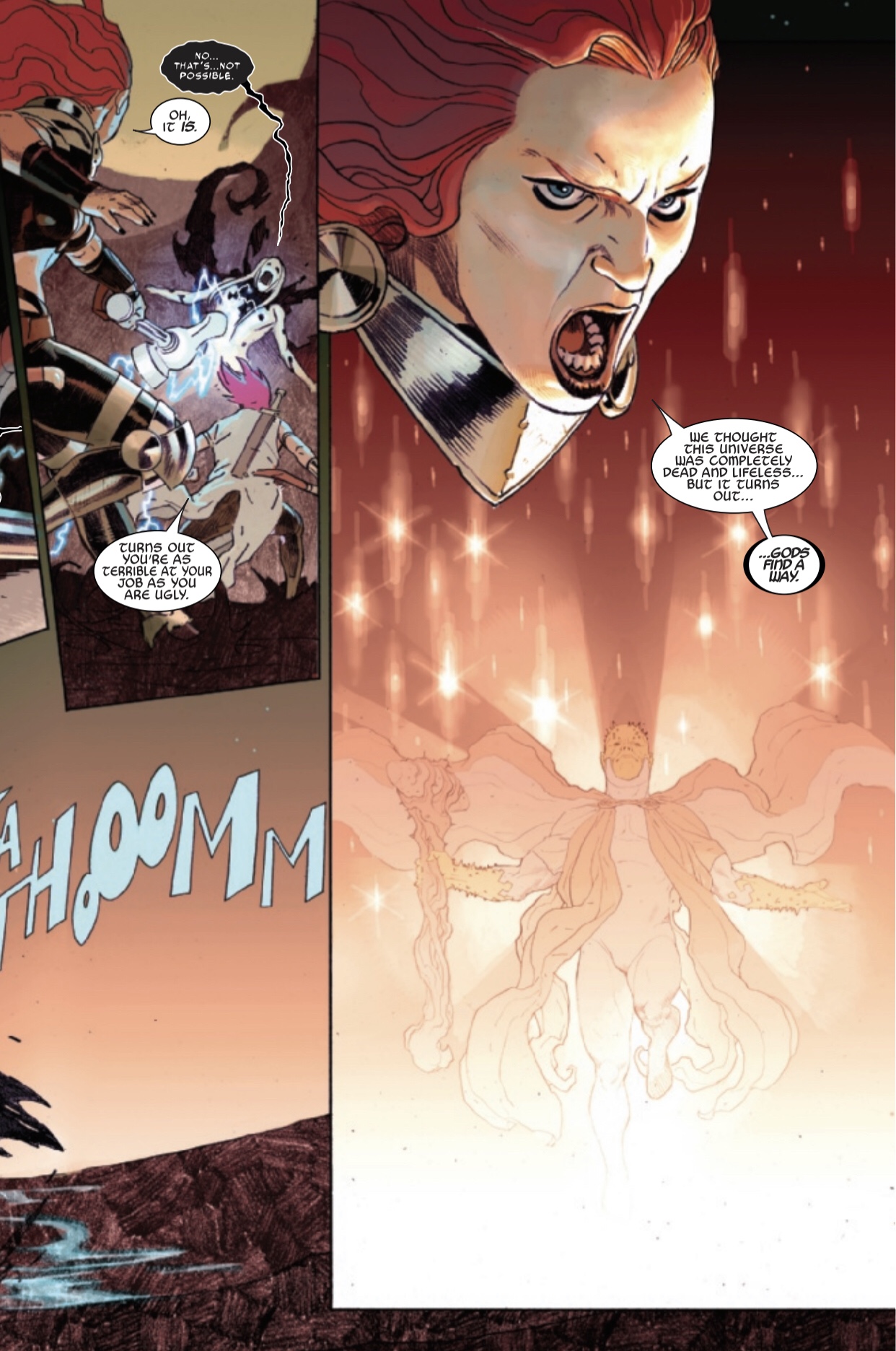 The weight of this comic simply feels exceedingly heavy however Aaron somehow manages to make the narrative heartfelt and full of life even on the brink of the entire universe transcending into darkness. The emphasis and driving force behind Aaron’s thunderous run have been watching ”a God” truly become ”Thee God”. Like any child, Thor has had to learn to laugh, to love, to fight, and to deal with lose. After millennia of growing into the All-Father, this issue amplifies the importance of family and shows that the only true way to defeat evil is with love. Aaron shows readers that love is the name of the game with the surprise saving grace that dips the entire way back to THOR: GOD OF THUNDER GODBOMB. If not for one simple action from a God finding his way in a lost world many years ago, the universe could already be destroyed forever.