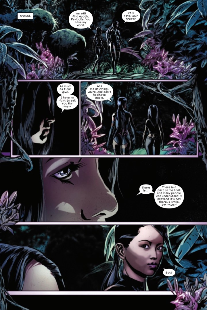 Psylocke finds herself in this new world of Mutantkind unsure of her place in it… but when a face from her past returns only to be killed, she seeks help from others who feel similar to get vengeance. Cable and X-23 join Kwannon for a personal mission that could jeopardize all Mutantkind!