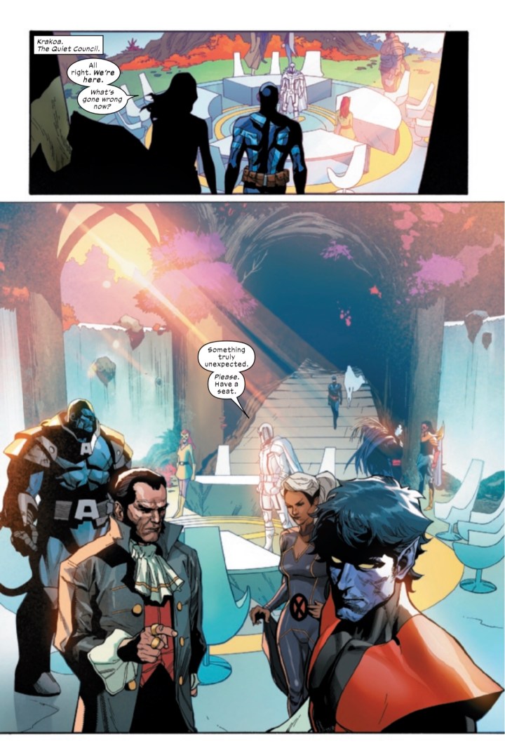 Now, even though the new villains seem to not fit the normal “bad guy” motive, there means behind infiltration makes a ton of sense within the confines of the overall plot. With Krakoa being such a vital plot thread to the Dawn of X, one could deduce this antagonistic thread as a possibly realistic angle for humanity. That said, the execution and the characters involved in the infiltration came off as silly and more of a joke than Hickman may have expected. At times, this reader felt the new villains were hard to take seriously. This critic didn’t know if Hickman intended the issue to be more humorous or more realistic. Sure, stories can have two tones however it’s extremely difficult to weave comedic tones into something meant to be heavier in nature and still take it seriously. This book isn’t a romantic comedy or even a satire. This X-fan feels Hickman’s overall intent is for his X-books to be taken sincerely and earnestly. My point is; the vibe of the antagonists were a bit too over the top and comical for my taste.