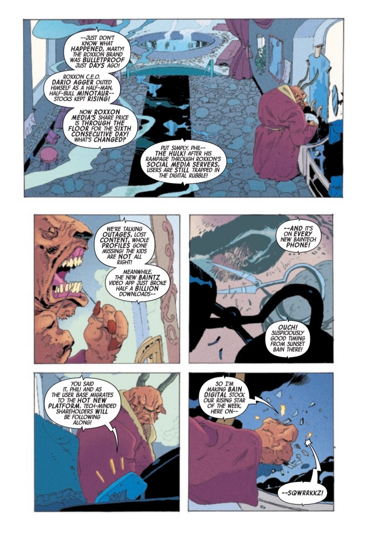 Al Ewing opens up a new direction for the Hulk in this week’s new tale. The overarching theme of something green, godly, and immortal that can stand the test of time has been placed on the back burner for a more current and relevant agenda. Ewing has always had two stories happening simultaneously. Now, the new surface-level story begins to get flushed out in the narrative of this issue. It turns out, a teen movement is forming across the Nation and Dario Agger, now known as a Minotaur and CEO of Roxxon, is stepping into the role that the prior Colonel played early on in this run. Sure, Dario doesn’t have a Shadow Base BUT readers will find a different tactical means that our new famous Minotaur decides to take in order to take down the Immortal Hulk.