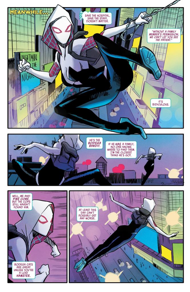 In the meantime we see Gwen as the Spider Ghost swinginfg through the streets inner monologuing about the Bodega Bandit and how the hospital won’t let her see him as she is not family and does not have permission from a family member. It is actually a typical response from a hospital. She then thinks how M.J. will be glad that she will be on time for band practice when she swings by the Jackal and Miles QWarren who are sitting in traffic waiting for her.They have laid a trap in a nearby store knowing that Gwen would never ignore pleas for help.