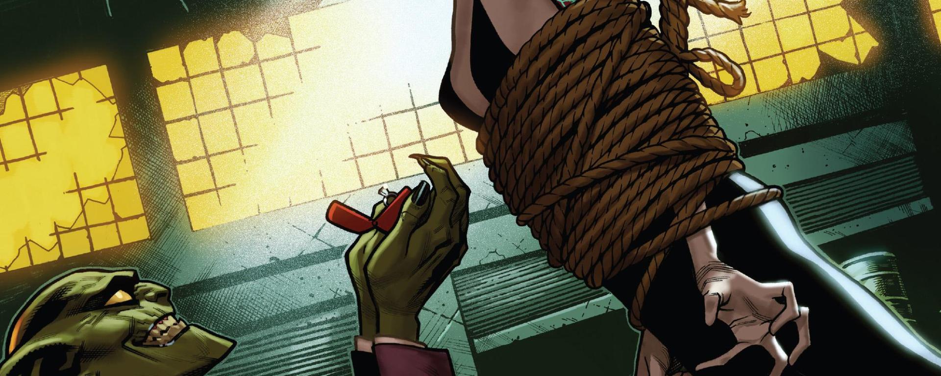 The Ghost Spiderswings into action only to be put down by a gas that we later find out is a sedative. The gas knocks Gwen out and the thugs take their prize while letting a mother and son go that they were using to lure in our spider. The thugs return to the Jackal and Miles Warren with Gwen and are instructed to strap her down to a gurney. It would seem that the plan all along was to retrieve Gwen’s necklace that she uses to travel between the 616 and the 65.Unbeknownst to the Jackal and Miles it will only respond to the Ghost Spider’s D.N.A.