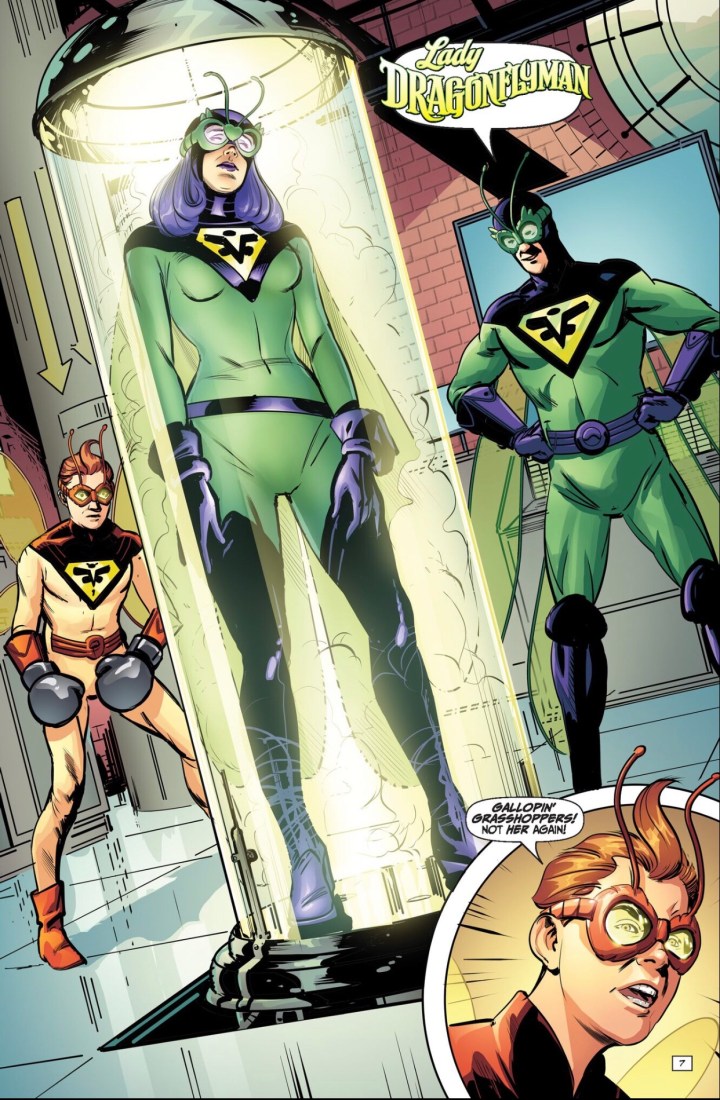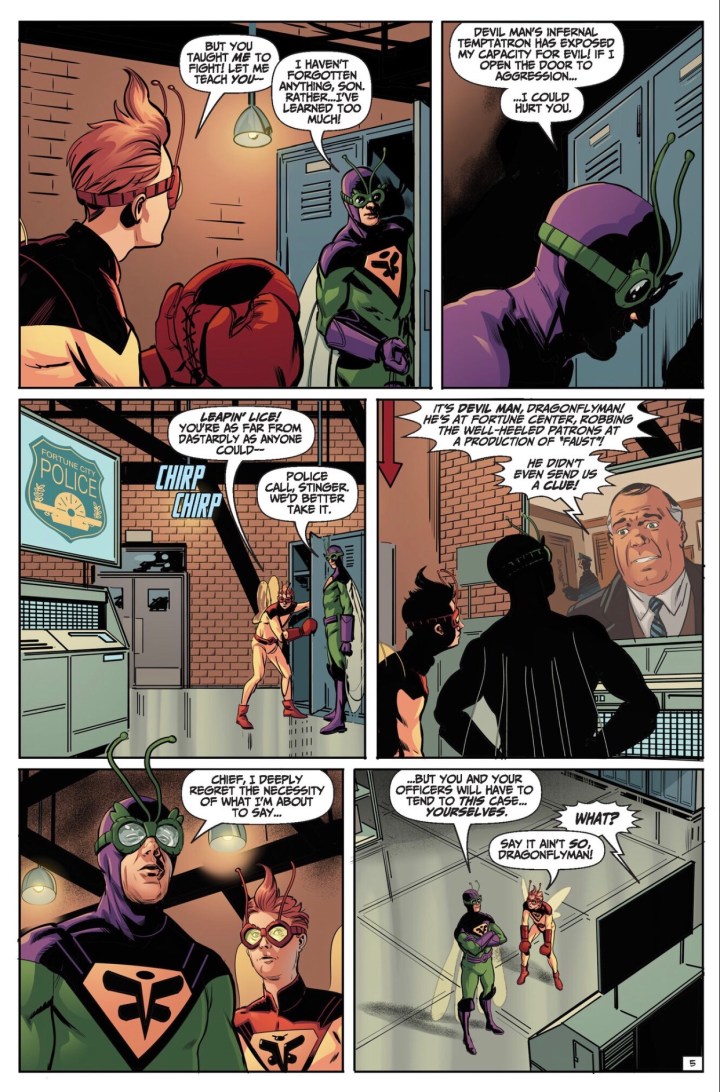 As Earth-Omega’s Stinger and Dragonfly continue to feud, Earth-Alpha’s dynamic duo tries to find a new way to move forward after Devil Man’s infernal temptations last issue. Are Stinger-Omega and Dragonfly beyond repair? And, who is this new Lady Dragonflyman? Let’s jump into this week’s DRAGONFLY AND DRAGONFLYMAN #3 by Tom Peyer and find out!