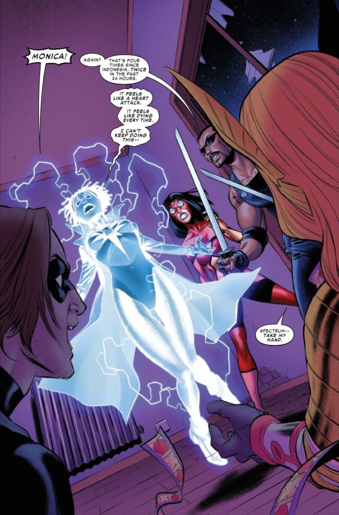 The team encounters Ghost, a villain I’ve only seen in the MCU to be completely honest, but in this particular issue, Ghost is experimenting on the “ghosts” of patience in a hospital. This is where the clunky back and forth repetitive dialogue took place. Angela just really wants to kill something, whether they are already dead or not. This leaves Spectrum as the key to both her own plan and Moonstone’s plan, another villain that just roles on into this issue. Who is by the way the evil genius of this whole hospital ghost plan apparently.