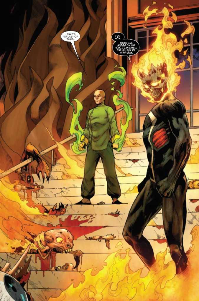 Meanwhile, back in Las Vegas Johnny has made it to The Inferno Hotel where they imprisoned Mephisto. Wong and him fight off some demons and then they fight off each other, because Johnny has come for Mephisto and Wong is there to keep him in prison so naturally fighting in-sues. Johnny easily enough over powers Wong. Makes his way to Mephisto’s cell and demands his help at controlling Hell. (That should go well. We really need to get a Ghost Rider that has at least half a brain.)