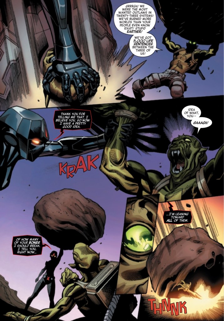 The issue opens in the Ravenstarr Prison Galaxy with the War Widow kicking ass and talking trash. Alright, that’s a good start! Plus, everything looks great, but the art has never been a problem in this series.