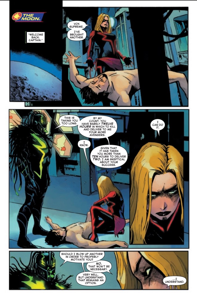 With Carol’s supply of cloned corpses of the Avengers she hopes to buy enough time for all of them to come up with a better idea on how to defeat this new Terror, The Vox Supreme. Everyone knows this is a bad idea giving this baddy a supply of Super Hero DNA but sometimes the best plan is the one you have, and until Carol is able to get any information about Vox’s plan out of him she has no other cards to play.
