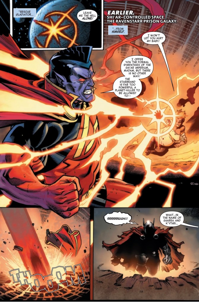 The issue opens a bit coy with Captain America, Captain Marvel, and Black Panther (maybe) looking at the woman we saw with the Starbrand last issue. Of course, there is the matter of Gladiator, and that’s when we rewind to see what happened.