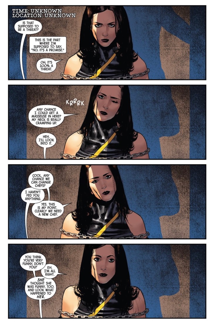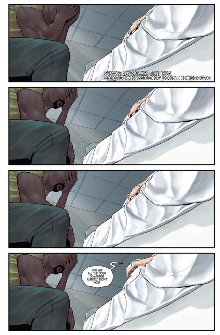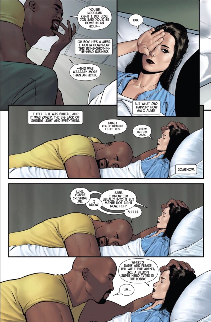 Guys, the cold open was spot on. Readers ultimately get the instant vibe from Mattia De Iulis’ panels and Kelly Thompson’s narration that there appears to be a possibility that Jessica is actually dead as Luke Cage hangs his head in grief. However, readers quickly see that everything is fine as Jessica is alive in her hospital bed with heroes surrounding her. Ok… so, how? Why? And what’s going on?! Well, that’s what this issue is basically all about. Jessica spends the issue exploring possible angles and reasons as to how and why this is happening through the perfect lens of a true “hero for hire”.