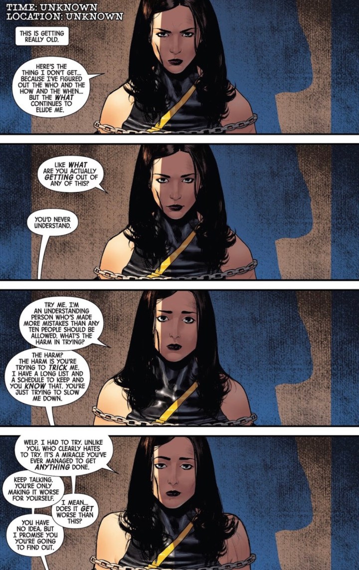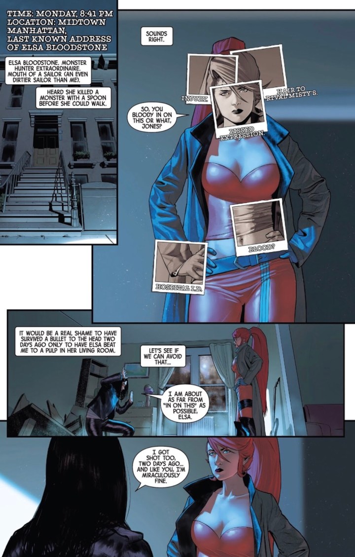 When we last left Jessica Jones, she found herself toe to two with Elsa Moonstone ready for a throwdown. It turns out, Jessica wasn’t the only survivor of a gunshot to the head. Ok, so what in the world do Jessica Jones and Elsa Moonstone have in common? And, who the heck is doing this? As of the last issue, Jones was about as lost as last year’s Easter egg. Let’s hop into JESSICA JONES: BLINDSPOT #3 by Kelly Thompson and see if she can make heads or tails of this $&@$ storm she finds herself in.