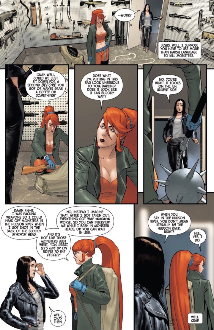 Now, even though the art was probably the best part of this week’s tale, Thompson’s story wasn’t too shabby either. A writer’s job is not only to tell a story but to also make you feel “something”. In this case, this reader felt like he was actually there with Moonstone and Jessica chopping away at the Hudson. Additionally, Thompson continues to reveal more to new readers of JJ, like me, about her character and perseverance. She is extremely blunt and doesn’t waste time. However, Thompson also uses this issue to focus on Jessica’s sheer strength. JJ is no pushover and can certainly hold her own against some of the best and the brightest. And more importantly, any reader can blatantly see the care Kelly Thompson has for Jessica Jones from her interactions with the carefully construed dialogue with whoever she comes in contact with. I said it last review and I’ll say it again; Thompson is a perfect fit for Jessica Jones!