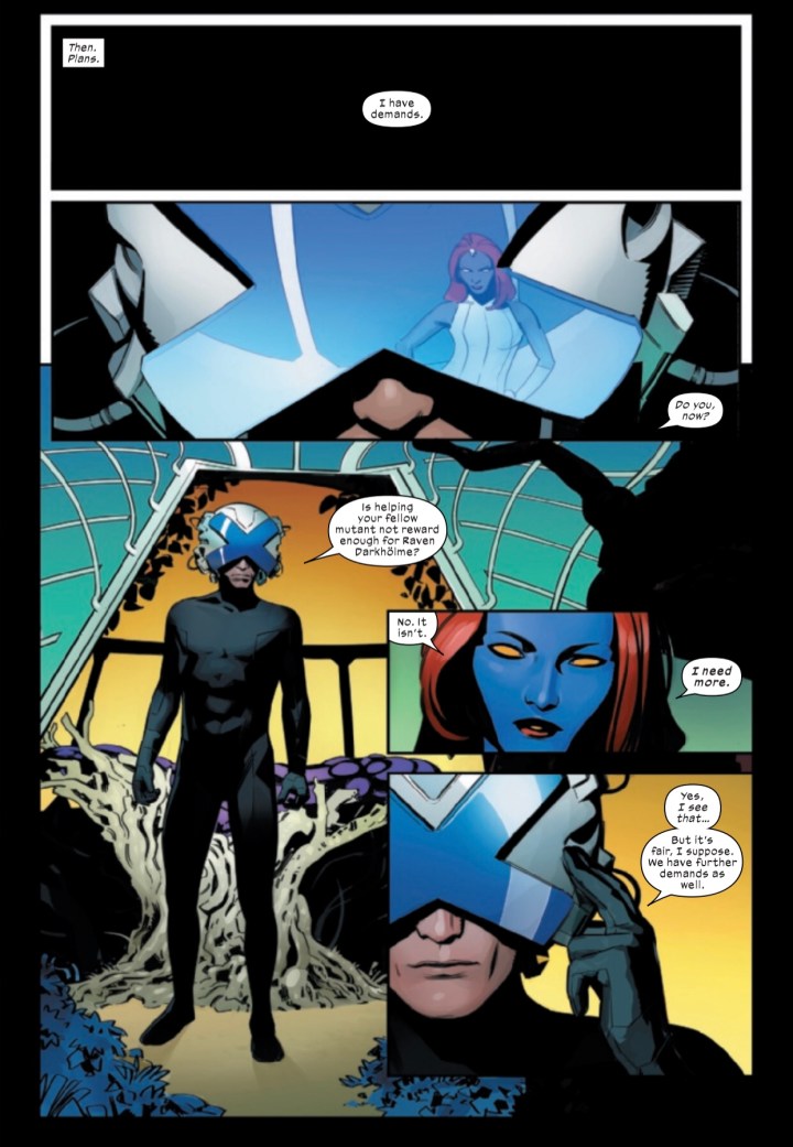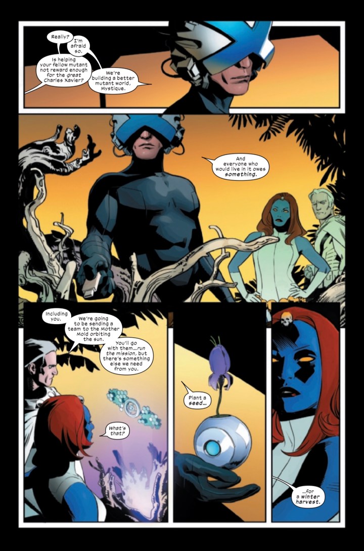 Back in the HOUSE OF X/ POWERS OF X event, Cyclops leads a team to a Mother Mold station that was orbiting the sun. Every member died while sinking the Mother Mold head into the sun. However, the space station still remained. More importantly; Mystique seemed to ver off track while Logan, Kurt, and Scott did the heavy lifting. Well, fans, it seems like there was a reason for Raven to steer off track and in this week’s issue of X-MEN #6 by Jonathan Hickman, we finally get some of those mysteries, explanations, and clarity solved. Let’s dive in and see what secrets have been growing between the spaces.