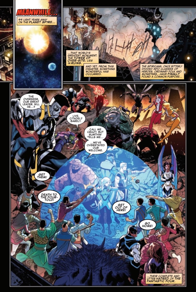 But not here, at least not right away. Sean Izaakse, Marcio Menyz & Erick Arciniega give me something that I have wanted to witness for the longest damned time. And Slott wrote it to be beautifully cathartic so that it doesn’t feel out of character for Reed to lose his temper and go full ham in a most personal way to a character in this book. The artwork, actually, is the strongest side of this conclusion personally speaking. The lush fantastical imagery of the world of Spyre still gives me goosebumps. This fractured world of gods and monsters, living in isolationist and xenophobic fear of EVERYTHING, not Spyre is a backdrop that almost perfectly reflects the generational gap in society today.