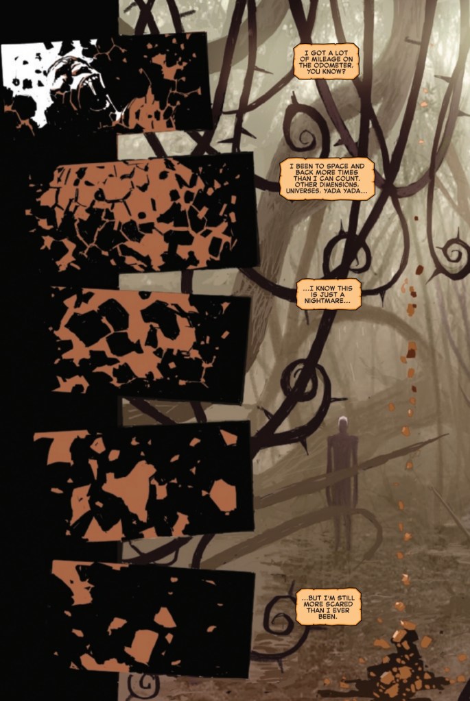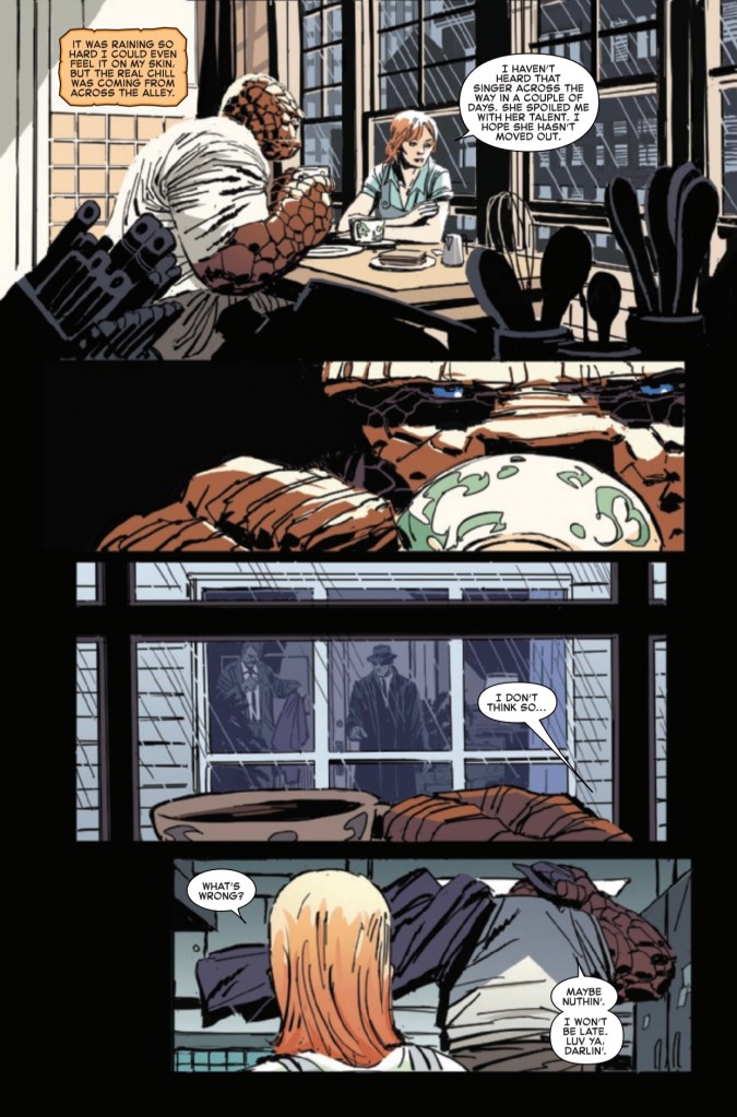 Gerry Duggan was spot on with the tone of this book to really get that Noir feel, unfortunately the title is a bit misleading. Noir is a genre that is heavily connected with criminal acts, detective work. Real Dick Tracey stuff. Duggan brings that into this book, but not enough to name the book after it though. Ben does investigate this nightmare he is having, and it ultimately leads him to the antagonist of the issue, but from then on, the issue fits more into a doctor strange book or even in a stand alone Fantastic Four book. Slapping this one-shot with a $4.99 price tag and selling it as something new and entirely different, just feels wrong.