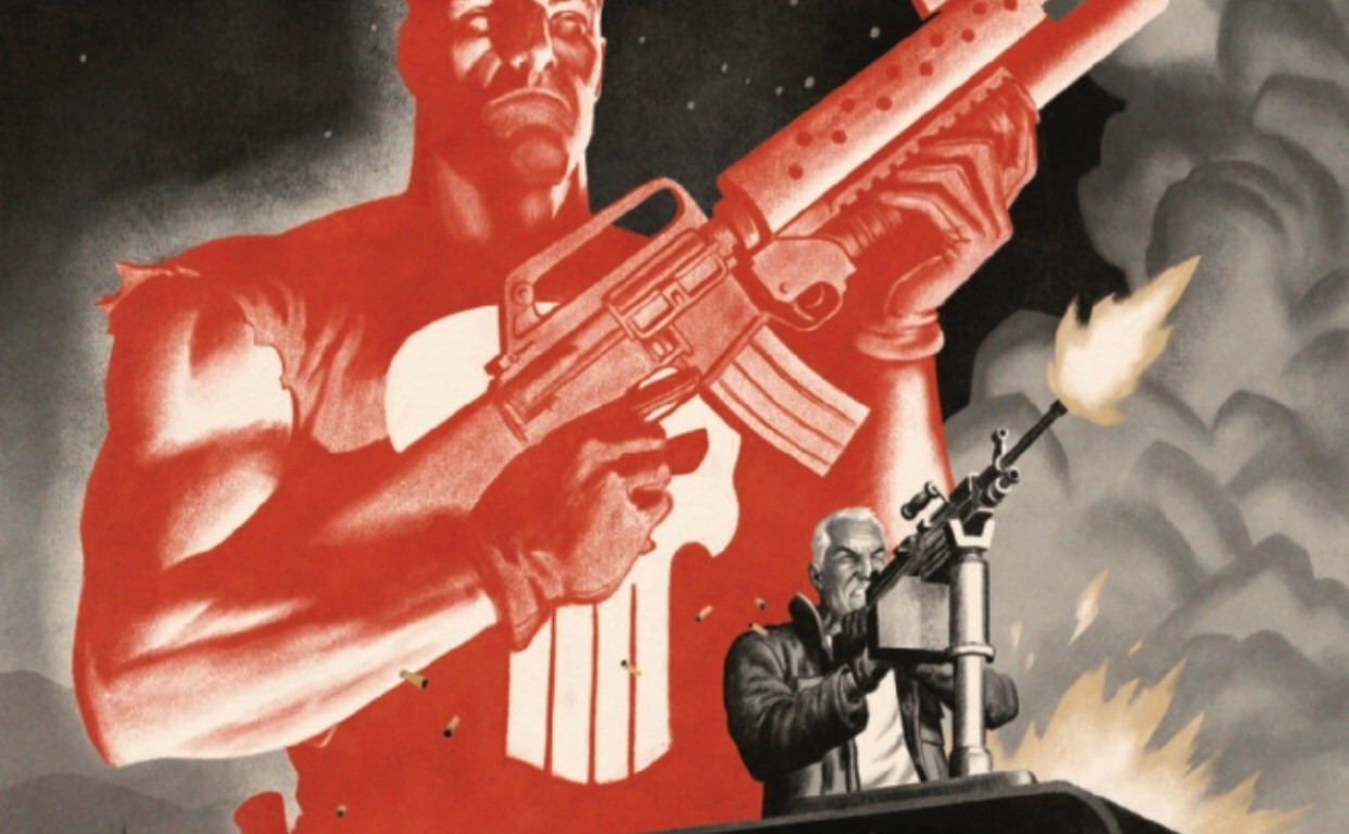 As our duo makes through the woods, less one hostage, Valery hints at leaving Pronchenko alive, to which Frank mutters “it’d be a first”. Yup. Valery complains about the power structure and how the people who run the country got there; cant’ say I blame him for the most part. After the “three assholes” cocaine and coffee break is interrupted by the minor inconvenience of a hail of bullets riddling their security personnel, Punisher, and Russian Punisher tie them up and get to work on a plan. Unfortunately, THEIR plan is also interrupted by – you guessed it – a hail of bullets. This is the Punisher, remember? After a mad dash from pinned under the vehicle to some big ass gun, Valery does his best ‘Johnny from Angels with Filthy Souls’ impression (the movie Kevin watches in Home Alone) and lights up the chopper. After some sweet action, and for a split second, and ONLY a split second, we think maybe Valery will make it. Well, he’s got a helicopter blade sliced literally halfway through his body. Looks like “our duo” are about to become “our uno”. Valery dies slumped over the blade like a badass. Frank never changes his facial expression. We end the issue with Frank standing over his comrade’s body, a downed enemy copter, and three assholes tied up in a trunk bed – status unknown.