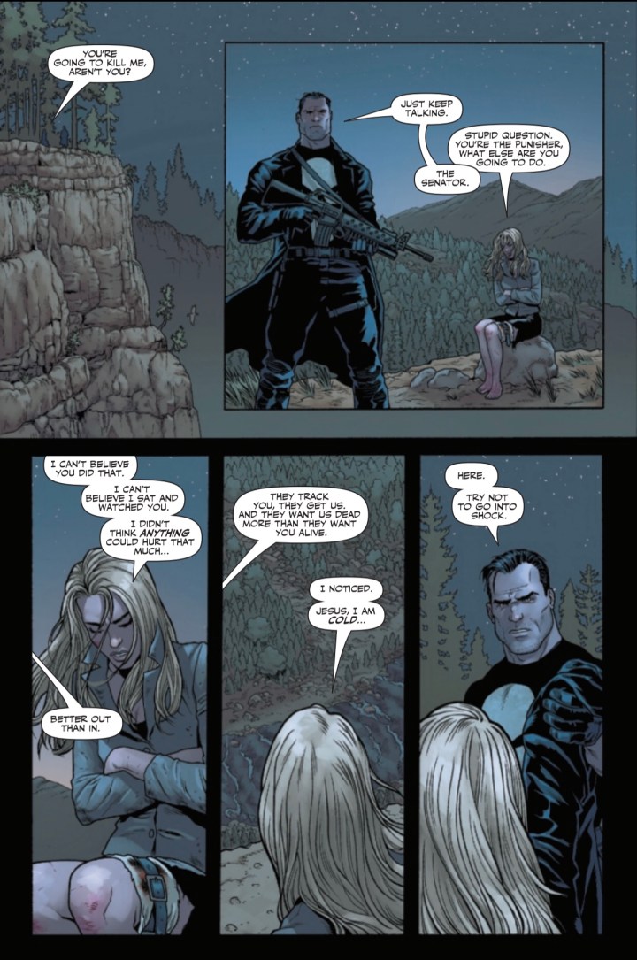 Sorry, I couldn’t resist. If you have no idea what the hell that opening was about, then I guess you haven’t read this issue yet, huh. SHAME! We open our fifth installment in a less than stellar situation if you happen to be the wife (fourth wife?) of a Russian bad guy. Being told that your hubby wants another person dead more than they want you alive has to sting a bit. Just apparently not as much as having a tracer gouged out of your thigh. At least Frank offers her his coat!