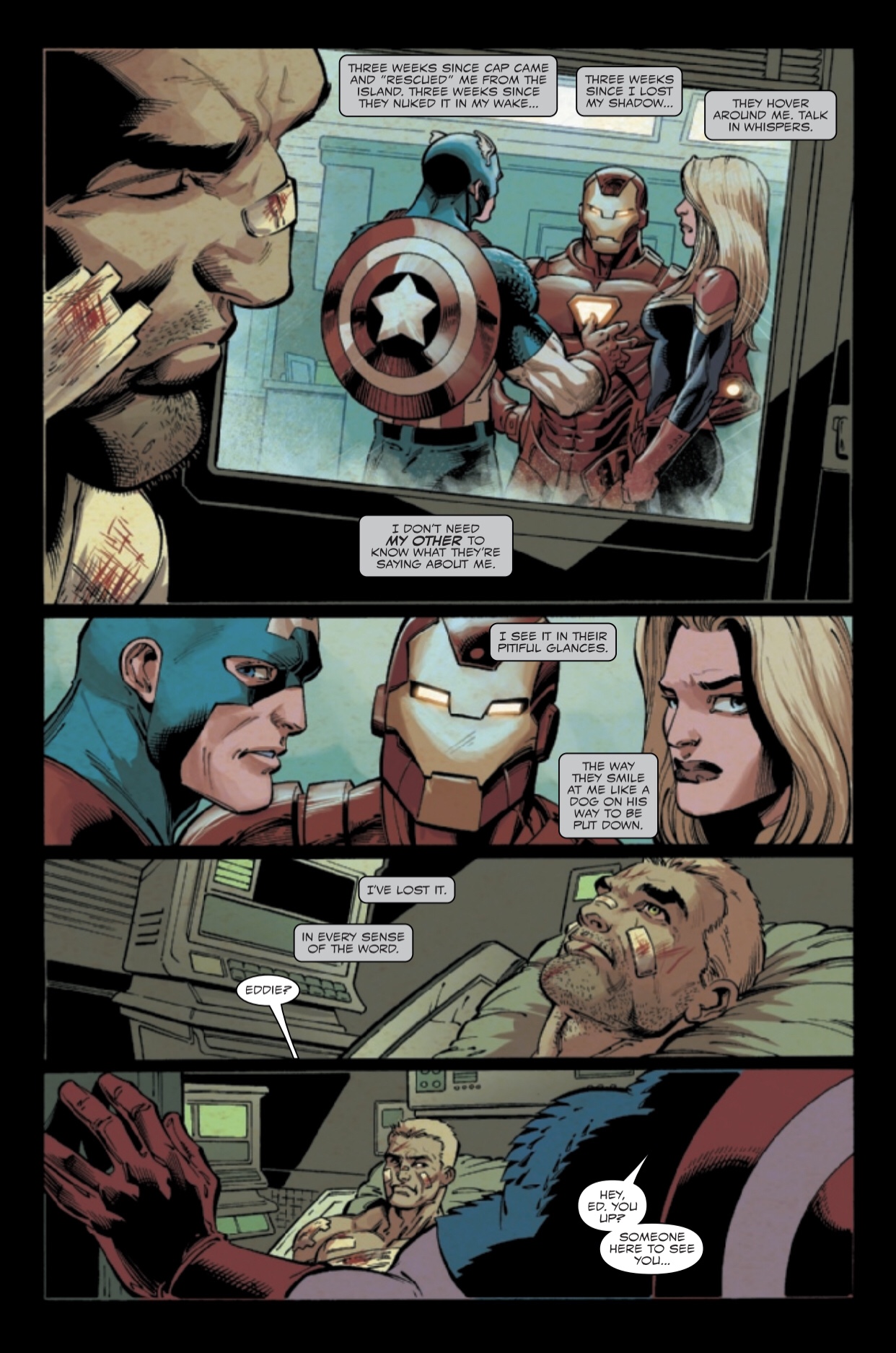 The reason I detoured into that rant is because I feel like this arc has overstayed its welcome, and that Venom Island probably could have resolved in less than five issue. Here, we’ve reached part four, and we still have the extra-long celebratory 25th issue for Venom Island to go out on. I wonder if this arc was planned like this, like this arc had to be extended long enough to finish on the next, 25th issue. Because I just don’t think we need five whole issues (again, the fifth one being a longer issue) to tell this particular story. What could have been a great, adrenaline-fueled story has felt really squandered. This story felt like it took the first two issues in a row just to set up the story, only to then drop the ball by issue three. Sure, issue three had some cool set-piece moments, but was this all we could do with a story where a Venom-less Eddie has to fight for his life against a hostile Carnagified island alone? We see Eddie surrounded by an army of Carnagified wild animals ready to tear him to shreds, with the de facto Carnage symbiote literally in front of him ready to take him over by the end of issue two, and sure, we get the shock and awe moment of Eddie cutting off his own hand to spite the Carnage symbiote, but by issue 3, we don’t get to see how he gets out of this back corner. The book’s just ready to move onto the next big shock and awe visual moment. Why hasn’t this book’s arc really done anything to justify being as long as Absolute Carnage, which was also five issues? For what we’ve gotten so far, this all would have been a better read if it was just a little shorter, though I prefer the alternative of it really taking its premise, setting, and conflict and doing more with it. But this is what we got, and its all been…good enough.