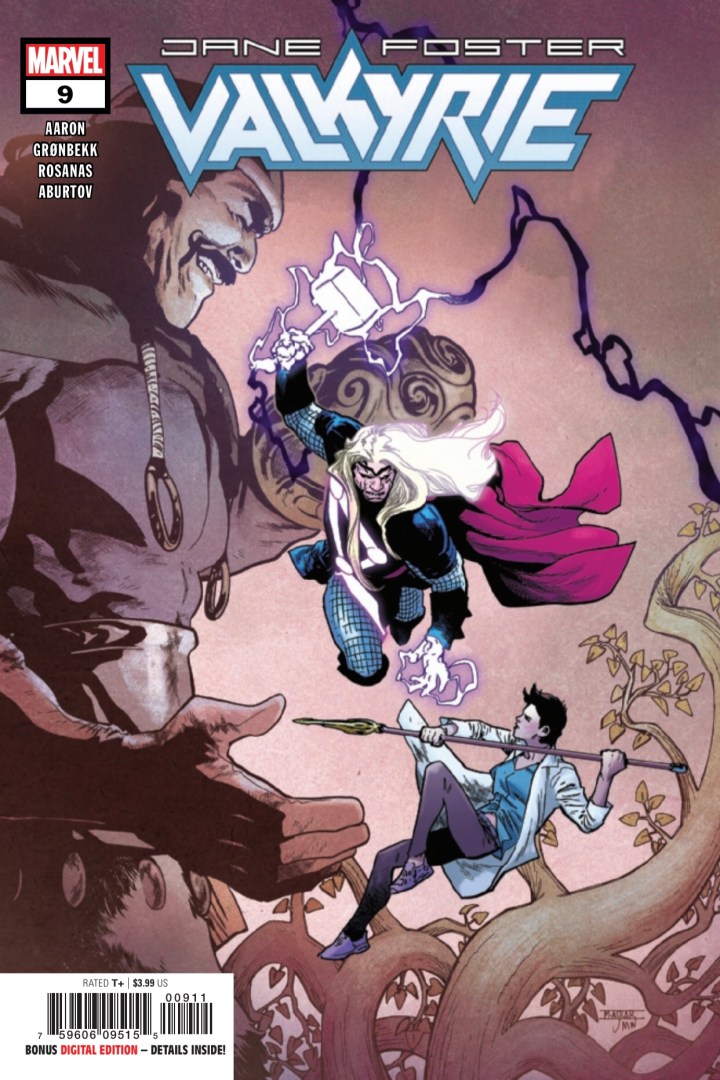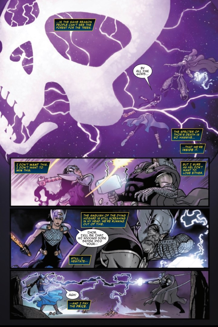 As Thor struggles in a losing effort to fight this infection and maintain self-control, Jane Foster turns to the ‘Sight of the Valkyrie’ in an attempt to gain some knowledge or advantage, and take back control of her friend and fellow hero. However, it’s difficult to see the entire forest through the trees when you’re IN the forest. Thor’s death looms so largely, they’re battling inside it without even realizing at first. We’ll touch on the fight more in the discussion on the visuals. After winning the battle, but about to lose the war, Jane struggles to catch her breath as Tyr twirls his mustache and villain-splains. As we’ve seen throughout this series so far, Undrjarn becomes what the wielder NEEDS. He may be annoying (per Jane) but his plan is successful; luring Jane to use her new all-weapon to accomplish what Tyr alone could not.