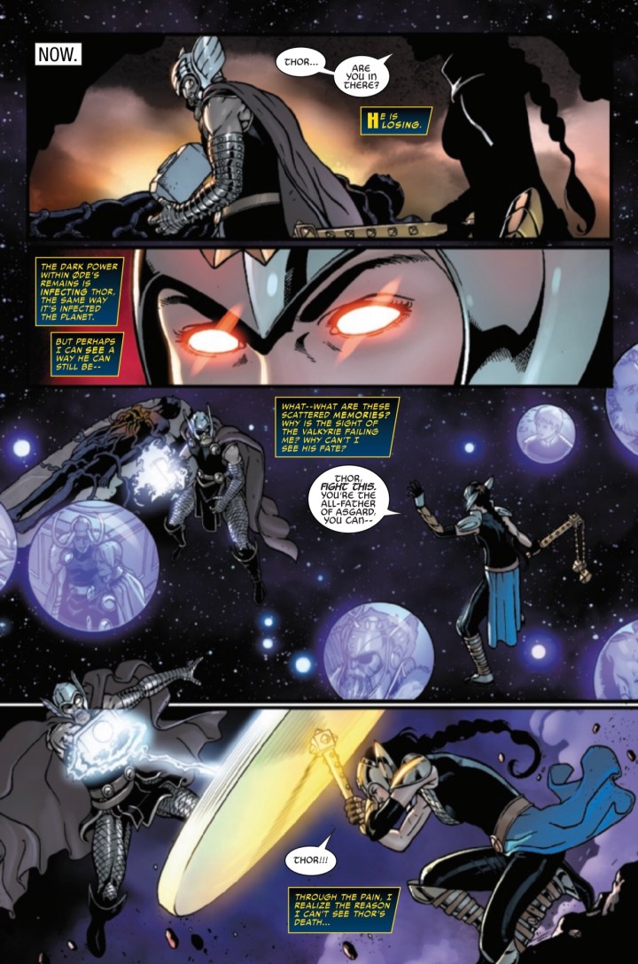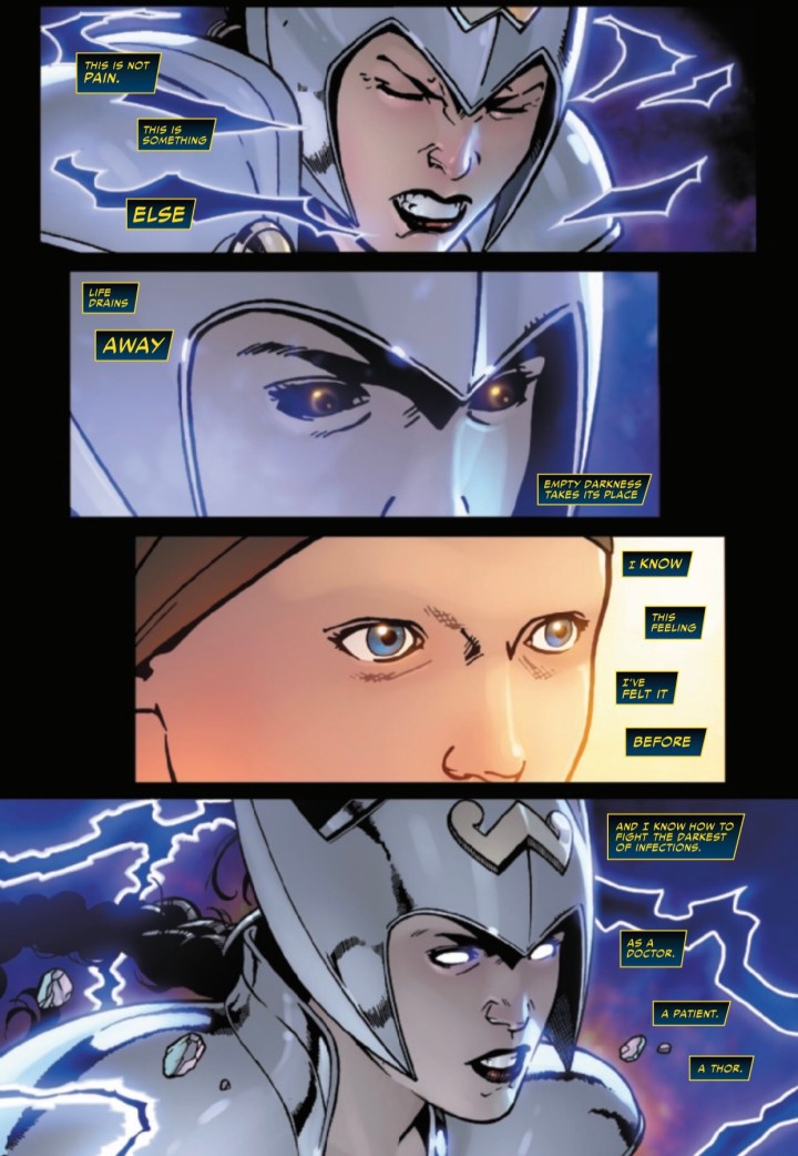 Now, let’s talk about art and coloring. If you’re a fan of ice hockey (stick with me here), you know that when referring to a traditional, “stay at home” defenseman, the less you hear their name over the broadcast the better. This player isn’t being flashy and skating coast-to-coast to score highlight-reel goals. But they’re always in the right position, working the fundamentals, breaking up plays before they become trouble, and making quick, simple break-out passes to turn the play the other way. Basically, if you never hear their name, it means they’re not making any mistakes and are executing their role effectively. But every now and then, that player seizes an opportunity to make a play, and you see them the next day on SportsCenter. That’s the best way to describe the art in this book. It’s consistent, and outside of a few flashy panels, you almost wouldn’t even notice it. It just serves the story. That being said, the panels of Jane battling Thor are pretty cool looking. Jane’s Valkyrie Vision transports us to the stars, each shining planet a potential fate. Mjolnir spews black lightning as they battle inside the blue and purple hues of Thor’s massive looming death. Jane erupts in brilliant light, wings spread reminiscent of Jean Grey wielding the Phoenix. The fight culminates in a gorgeous two-page splash, infected Mjolnir versus the healing doctor’s Undrjarn, with milestones in Jane’s memory rounding out the action. Jane pierces Ode’s heart as the earth is enveloped in light versus infection. The final panel of Tyr revealing the Rokkva is simple, grim and foreboding. This quiet, ‘get the job done’ defenseman just stole the puck, split the D and ripped one bar-down for the game-winner. Ok, enough with the hockey references. Plain English: the art in this issue is awesome and a notch above what we typically see.