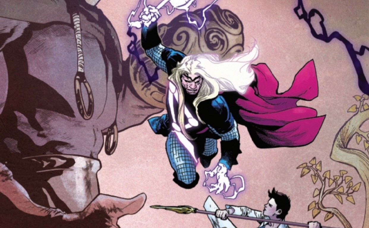 As Thor struggles in a losing effort to fight this infection and maintain self-control, Jane Foster turns to the ‘Sight of the Valkyrie’ in an attempt to gain some knowledge or advantage, and take back control of her friend and fellow hero. However, it’s difficult to see the entire forest through the trees when you’re IN the forest. Thor’s death looms so largely, they’re battling inside it without even realizing at first. We’ll touch on the fight more in the discussion on the visuals. After winning the battle, but about to lose the war, Jane struggles to catch her breath as Tyr twirls his mustache and villain-splains. As we’ve seen throughout this series so far, Undrjarn becomes what the wielder NEEDS. He may be annoying (per Jane) but his plan is successful; luring Jane to use her new all-weapon to accomplish what Tyr alone could not.