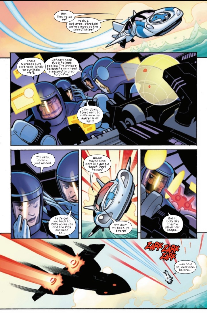 So far, the story has been more Fantastic Four driven than X-Men centric. The Good Professor has made endeavors to get Franklin Richards to live on Krakoa with the other mutants. However, Reed, being the super-intelligent, overly worried, helicopter Father, placed an inhibitor on his son so he would be unable to enter Krakoa by means of a gate. Well, as we would all imagine, that blew up in Reed’s (Father of the Year) face prompting Franklin and Valeria to stow away on the Marauder’s boat, which actually wasn’t heading “directly” to Krakoa and eventually became intercepted by Uncle-Doctor Doom. Meanwhile, thinking Charles kidnapped his boy, the Fantastic Four snuck onto Krakoa, fought the X-Men on their home turf, escaped, and have been shot down on some random island awaiting another battle with the X-Men while Franklin’s whereabouts are still in question to both parties. That’s because Uncle-Doctor Doom is working on a way to restore Franklin’s powers. Now, I think we’re all caught up! Let’s dive into X-MEN/ FANTASTIC FOUR #3 by Chip Zdarsky to see the fallout from Reed’s parental choices as well as the ensuing fight that’s about to unfold between the X-Men and the Fantastic Four who’ve never really seen eye to eye.